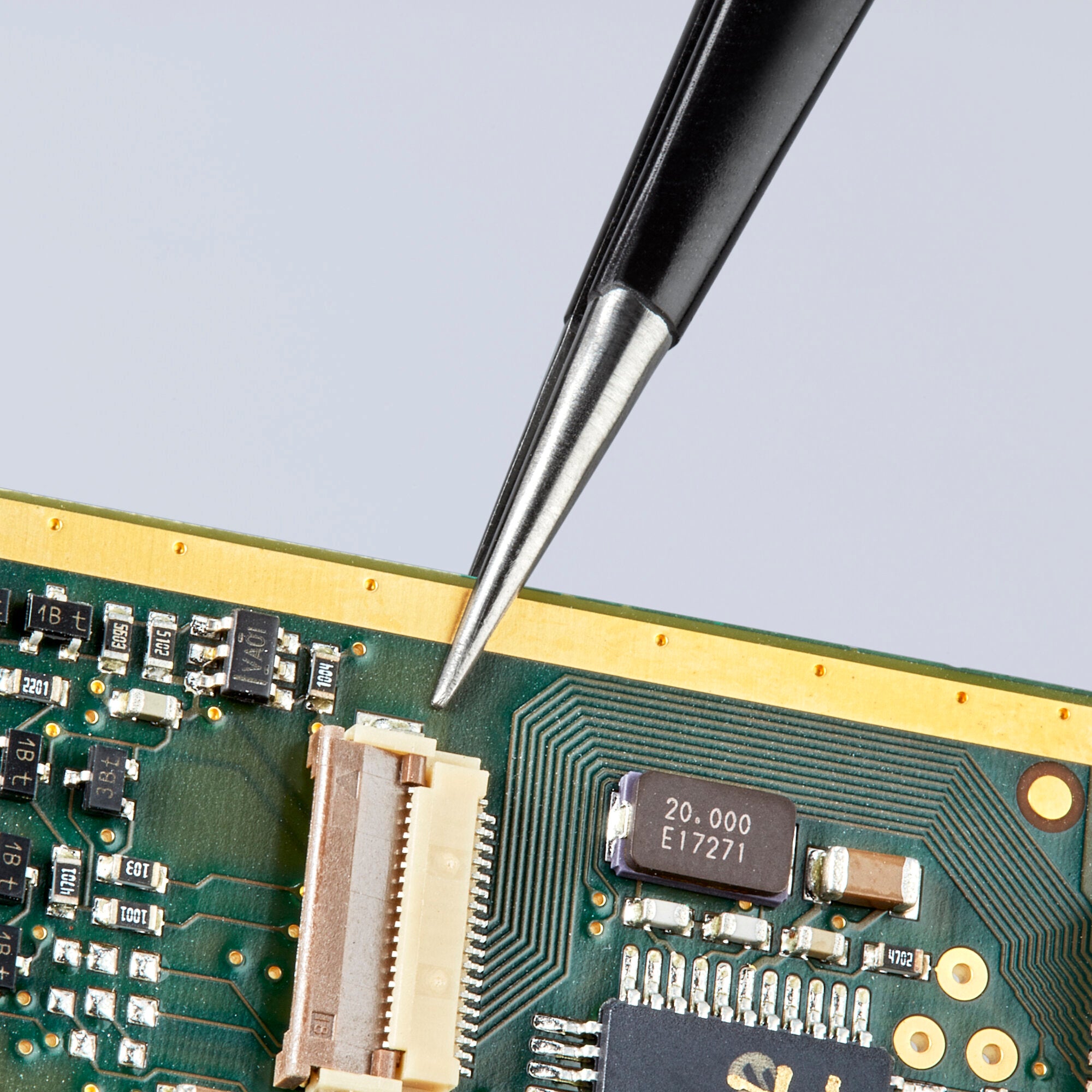 Stainless steel offers corrosion resistance. Straight tips provide excellent precision and control when picking up and handling small objects. Pointed tips offer precise gripping of fine components. Smooth gripping surface will not mar fine components. Smooth handles minimizes any potential interference with surrounding materials. 80% anti-magnetic design minimizes magnetic interference. ESD handle versions discharge electrostatic energy through the handles in a gradual and controlled manner (Dissipative 104/109 OHM regarding DIN EN 61340-5-1).