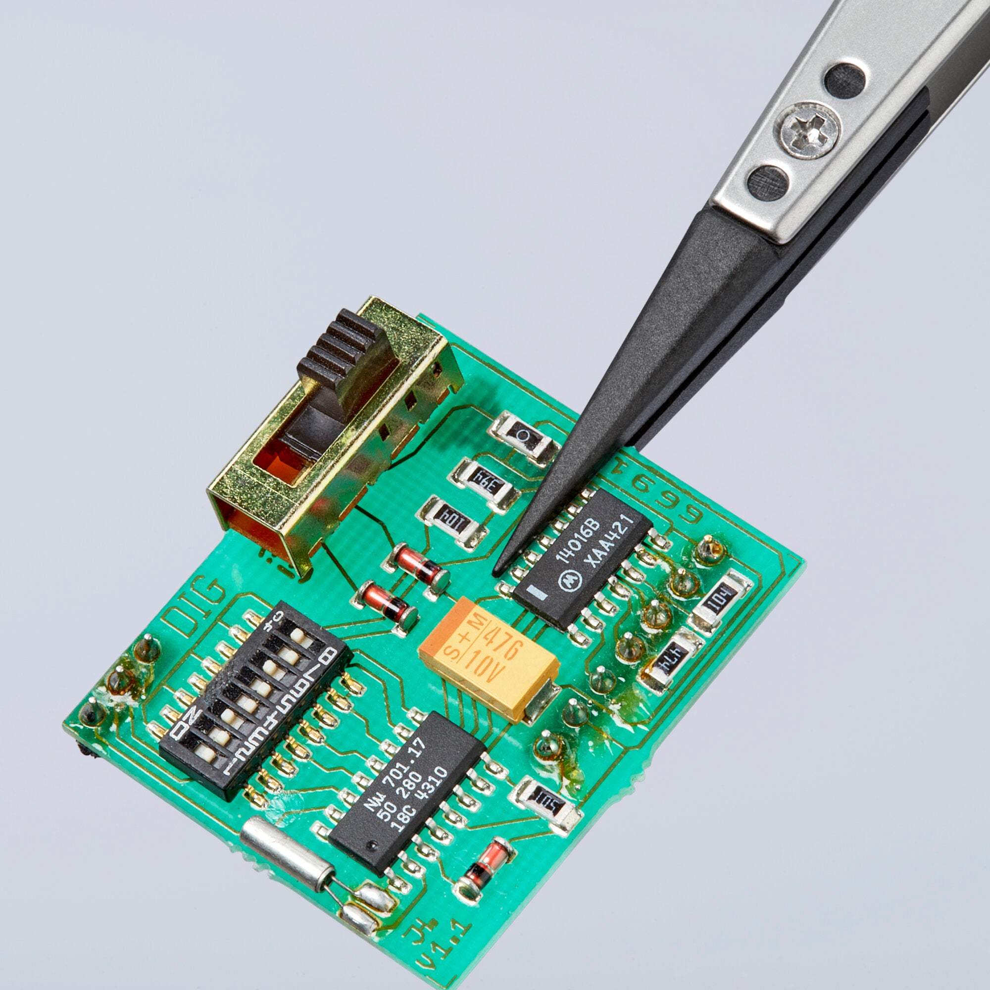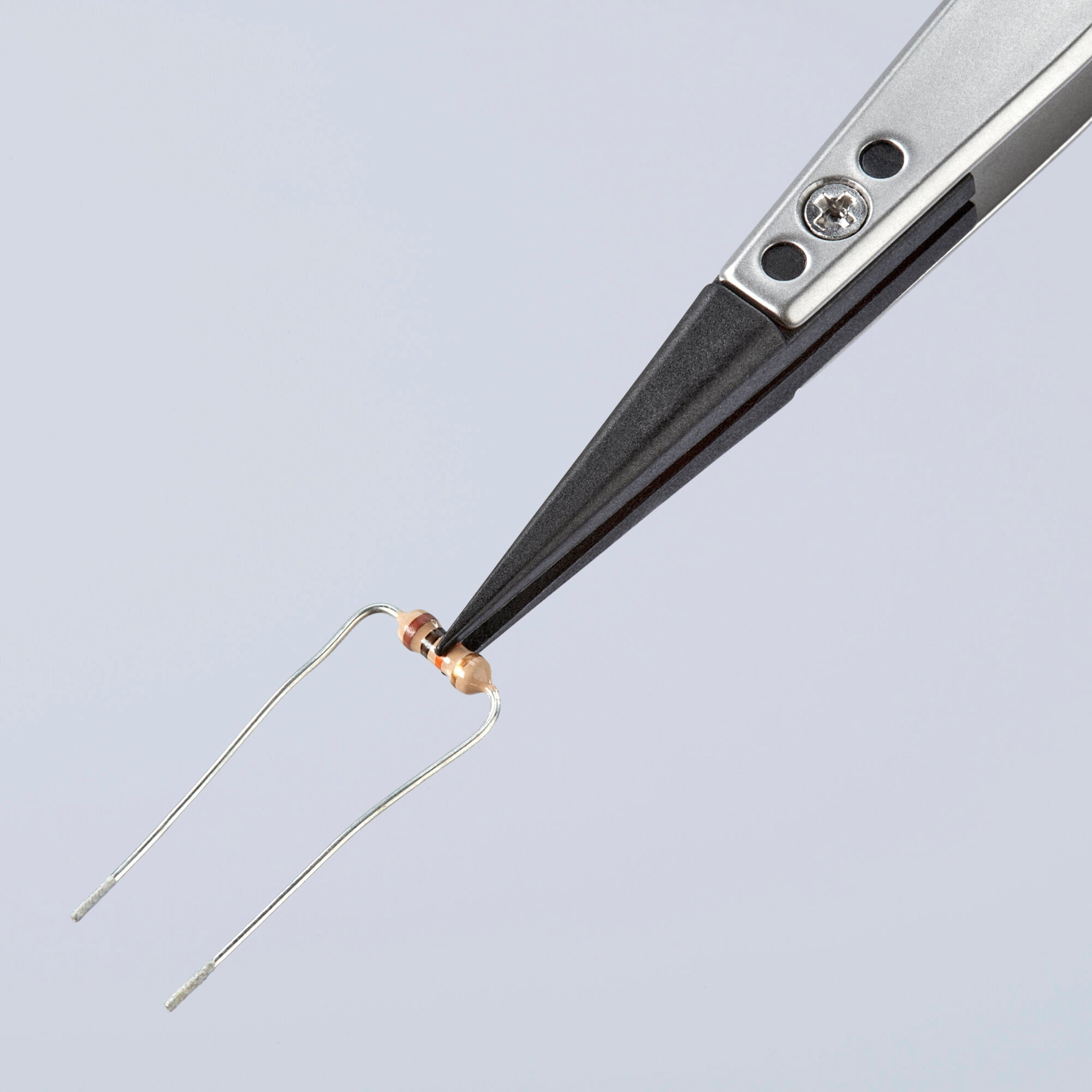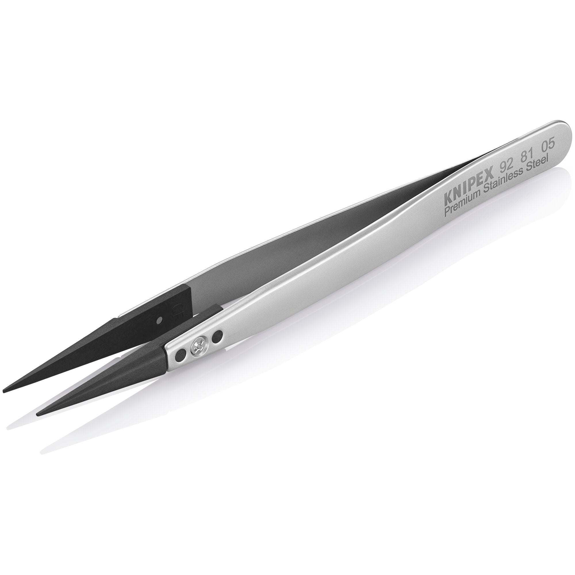 Premium stainless steel resists most chemicals, salts and acids. Straight tips provide excellent precision and control when picking up and handling small objects. Pointed tips offer precise gripping of fine components. Smooth gripping surface will not mar fine components. Smooth handles minimizes any potential interference with surrounding materials. 80% anti-magnetic design minimizes magnetic interference. Uses replaceable ESD tip (Conductive 102/103 OHM regarding DIN EN 61340-5-1) - Part Number 92 89 05.