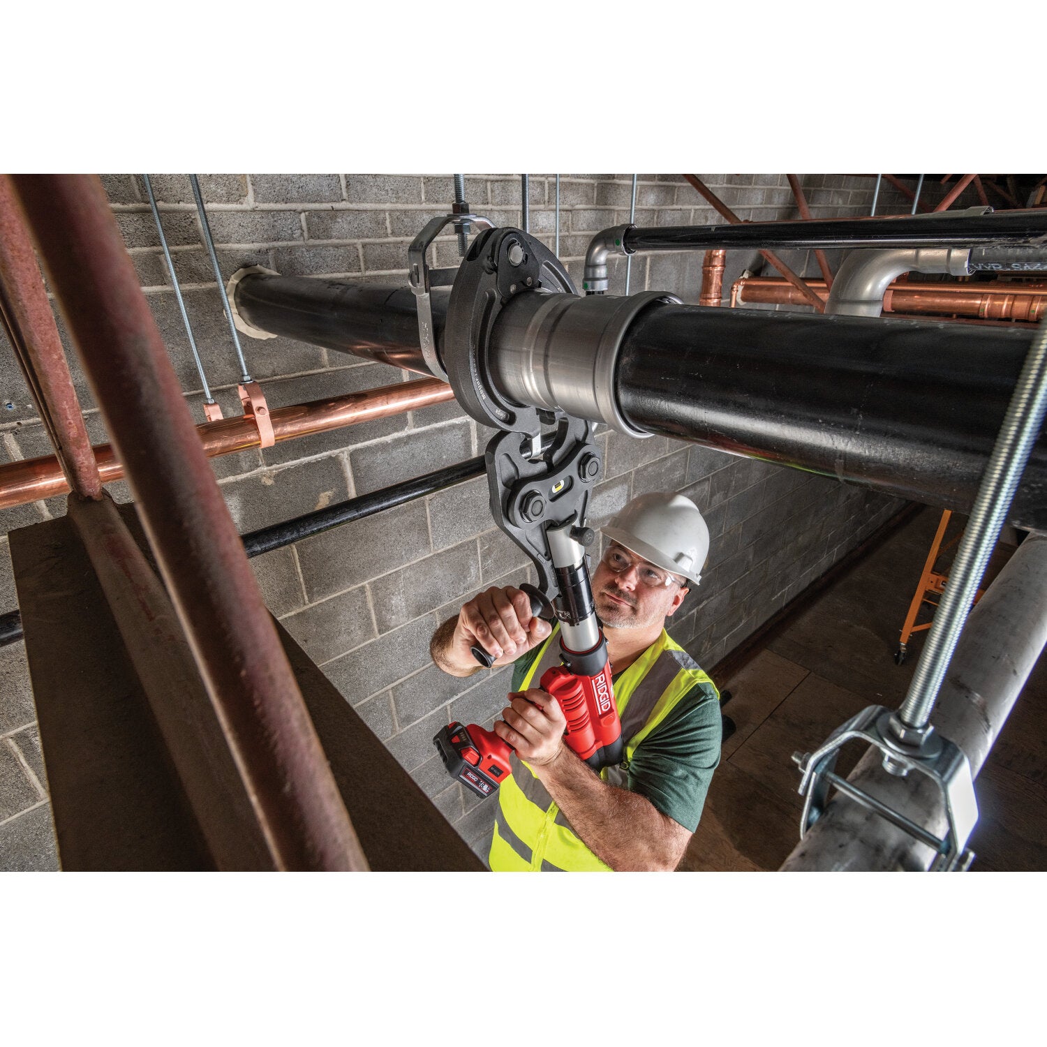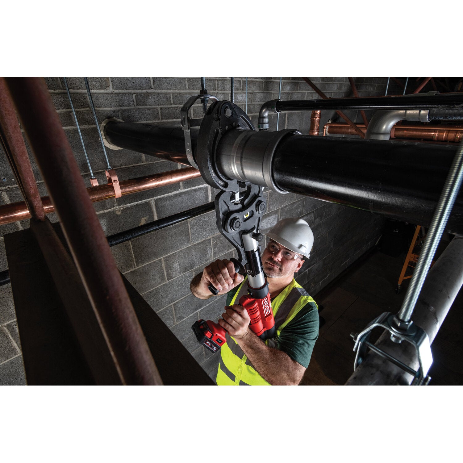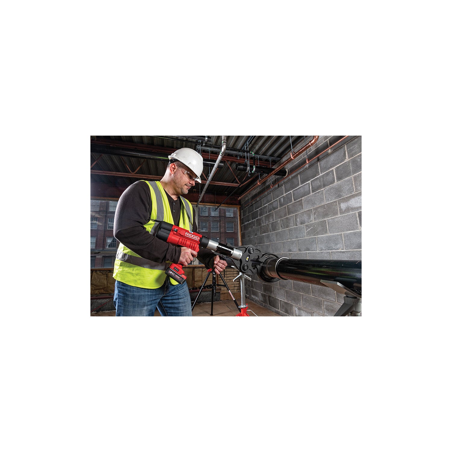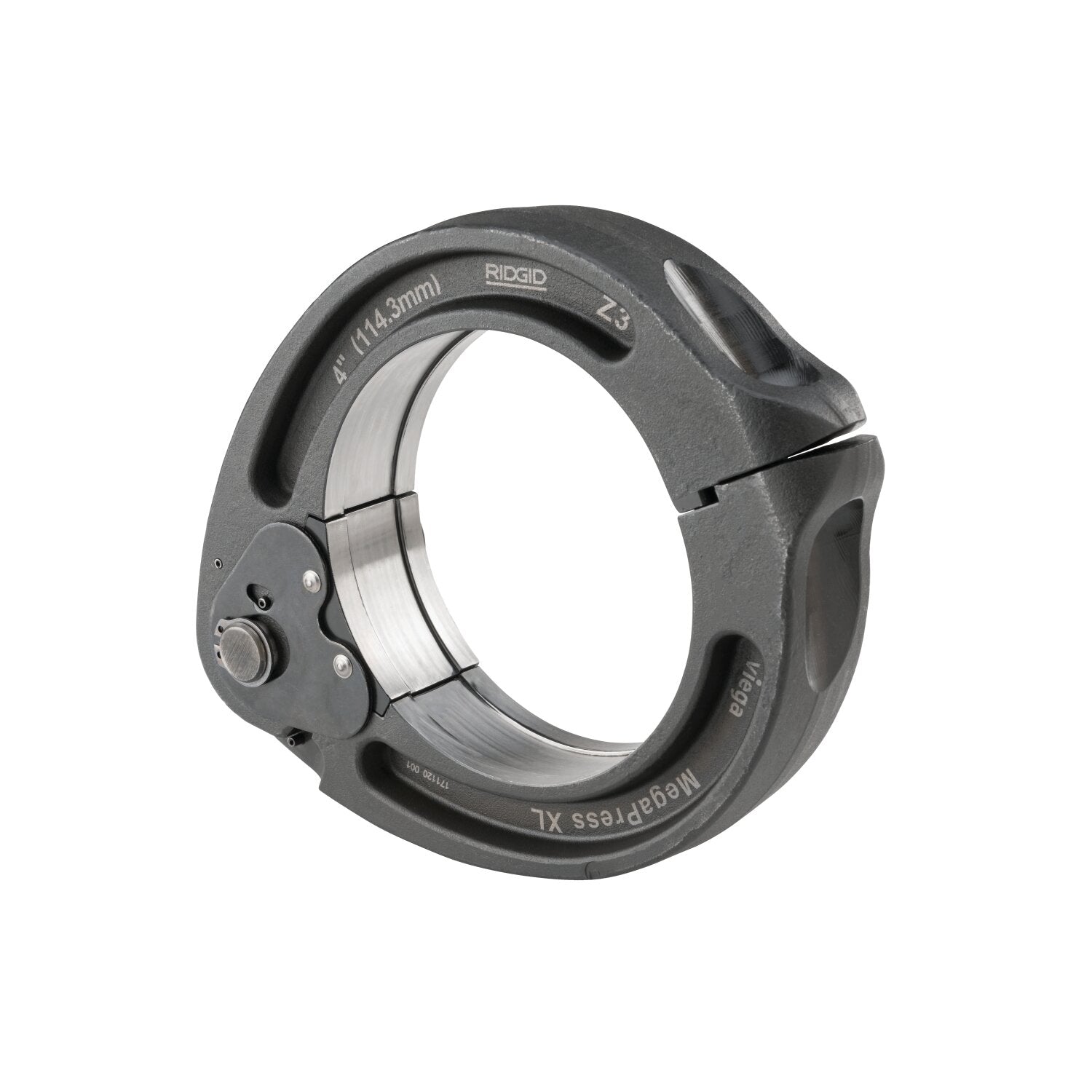 The RIDGID 4" MegaPress Ring is designed for seamless and efficient pressing of carbon steel pipes, offering an innovative flameless solution that eliminates the need for hot work permits. It works seamlessly with RIDGID Standard Press Tools to quickly connect pipes up to 4" in less than 25 seconds, even on wet systems. Engineered with a swivel actuator, it allows tools to position fluidly around the pipe being pressed. Collaboratively developed with Viega MegaPress XL fittings, it ensures reliability and performance in demanding applications, backed by RIDGID's Full Lifetime Warranty.