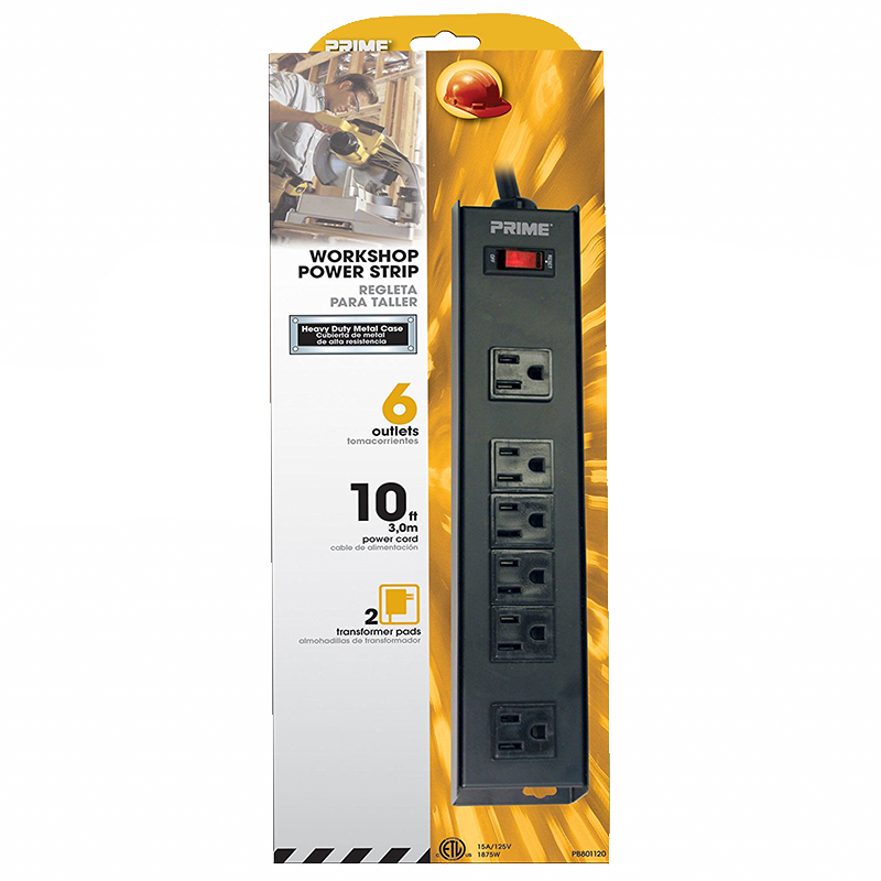 6-Outlet Metal Power Strip Includes an extra long 10 Foot Cord Built in Circuit Breaker protects against overloads & a Lighted On/Off Switch Slim plug designed to allow furniture to sit closer to wall Includes Two Wide-Spaced Outlets for Transformer Plug