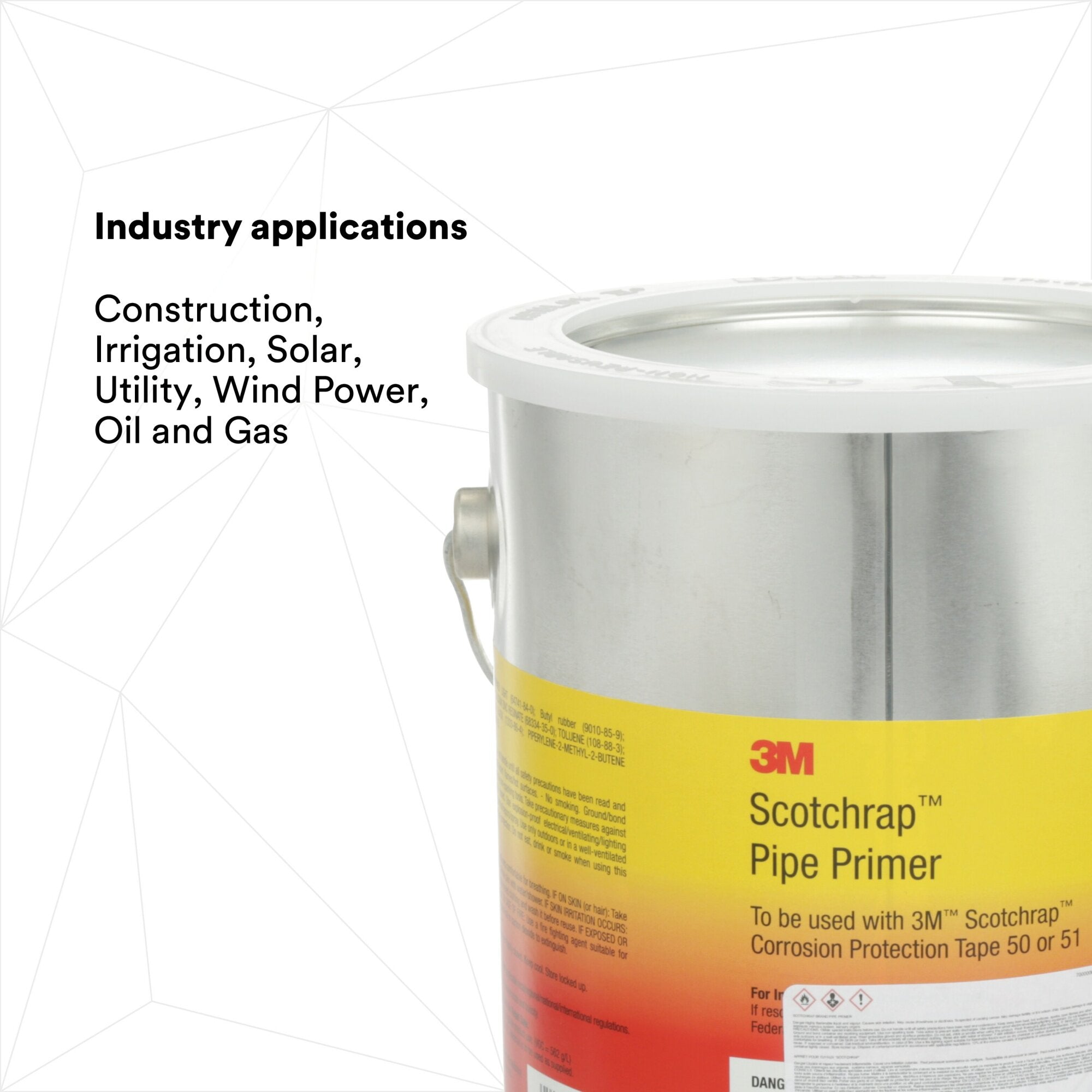 3M Scotchrap Pipe Prime is a quick drying, non sag rubber base primer that permeates metal surface pits and irregularities, preparing the surface for tape application. Compatible with the special adhesive on 3M Scotchrap Tapes, it enhances adhesion. To be used with 3M Scotchrap Corrosion Protection Tapes 50 and 51. 1 gallon can.Compatible with the special adhesive on 3M™ Scotchrap™ Tapes, it enhances adhesion. To be used with 3M™ Scotchrap™ All Weather Corrosion Protection Tapes 50 and 51.