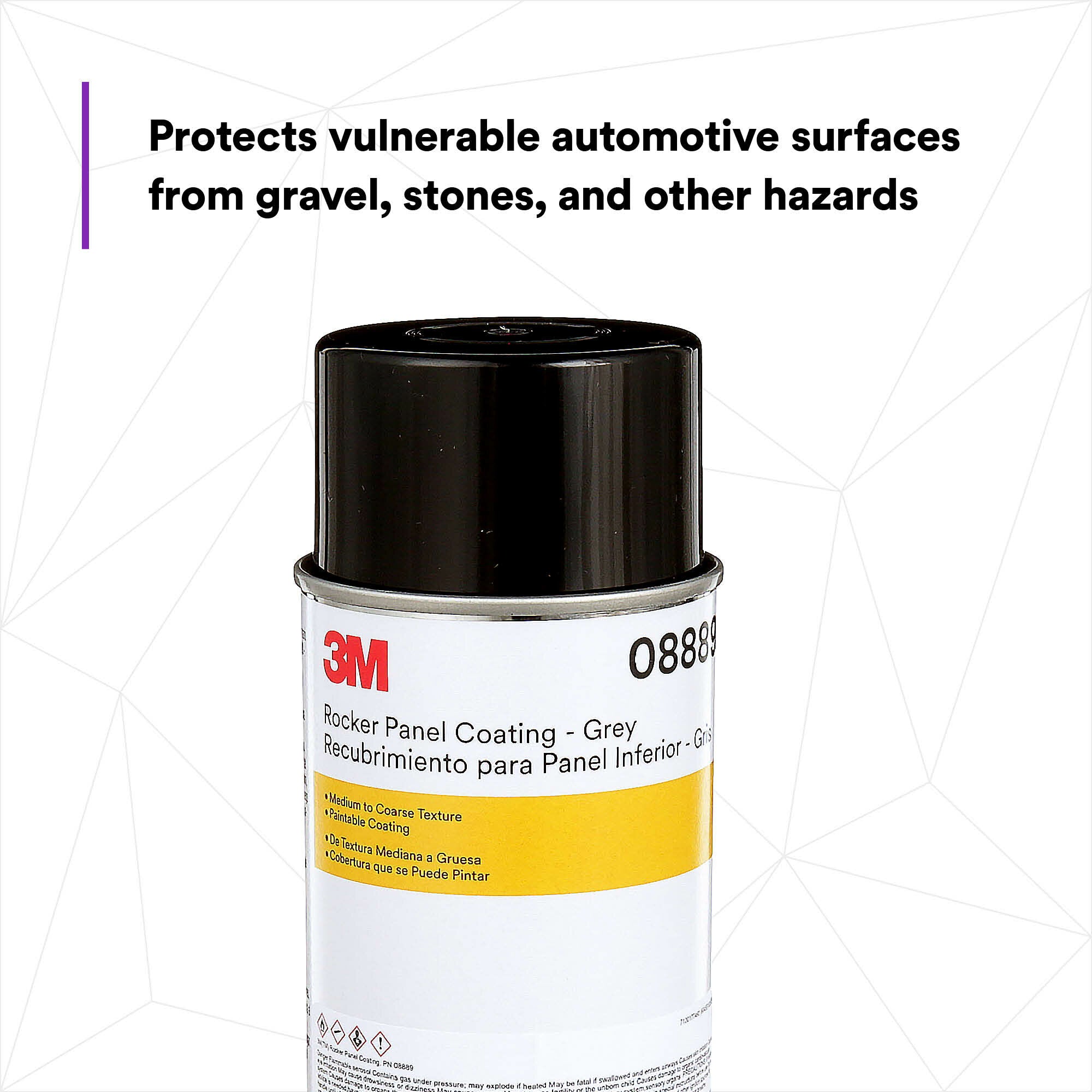 Specifically developed to match medium to coarse OEM textures, 3M™ Rocker Panel Coating provides an additional layer of protection to vulnerable automotive surfaces. This spray-on formula is excellent for use on rocker panels, lower body panels and other areas which are more likely to be exposed to the impact of gravel and stones. It applies right from the can to primer coated panels and under top coats. The light gray coating is fully paintable and compatible with common automotive paints and paint systems. It resists chipping and abrasion, and reduces the chance of rust and exterior corrosion due to bare metal exposed to weathering.