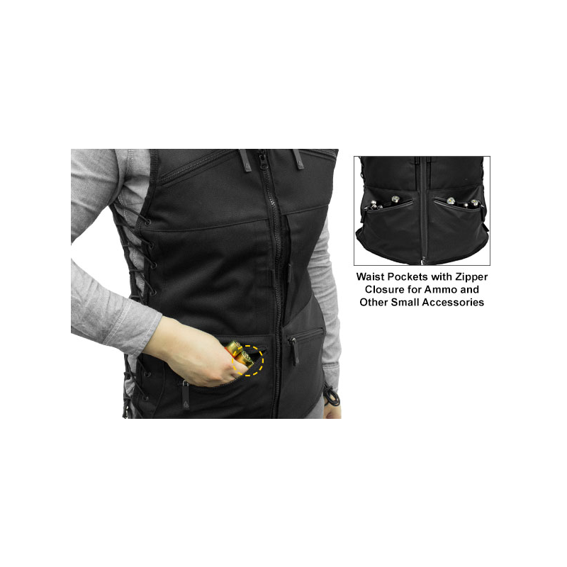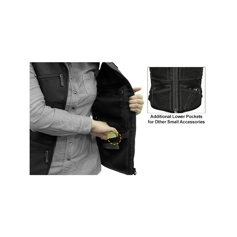 • Front Outside Pockets - 2 Zippered Chest Pockets for Smart Phone, Protective Glasses and Ear Plugs; 2 Hidden Horizontal Body Pockets with Hook-and-loop Closure for Small Frame Pistols