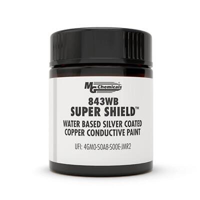 The 843WB-15mLSuper Shield Water Based Silver Coated Copper Conductive Coating is a one-part urethane system pigmented with highly conductive silver coated copper flake. It is easy to use, with no let-down, and no heat cure necessary. It can be applied by spray, brush, or roller. The cured coating is smooth, durable, and adheres well to plastics, wood, metal, and ceramics. It also bonds well to drywall and can be painted over with common architectural paints.- Provides excellent electromagnetic shielding
