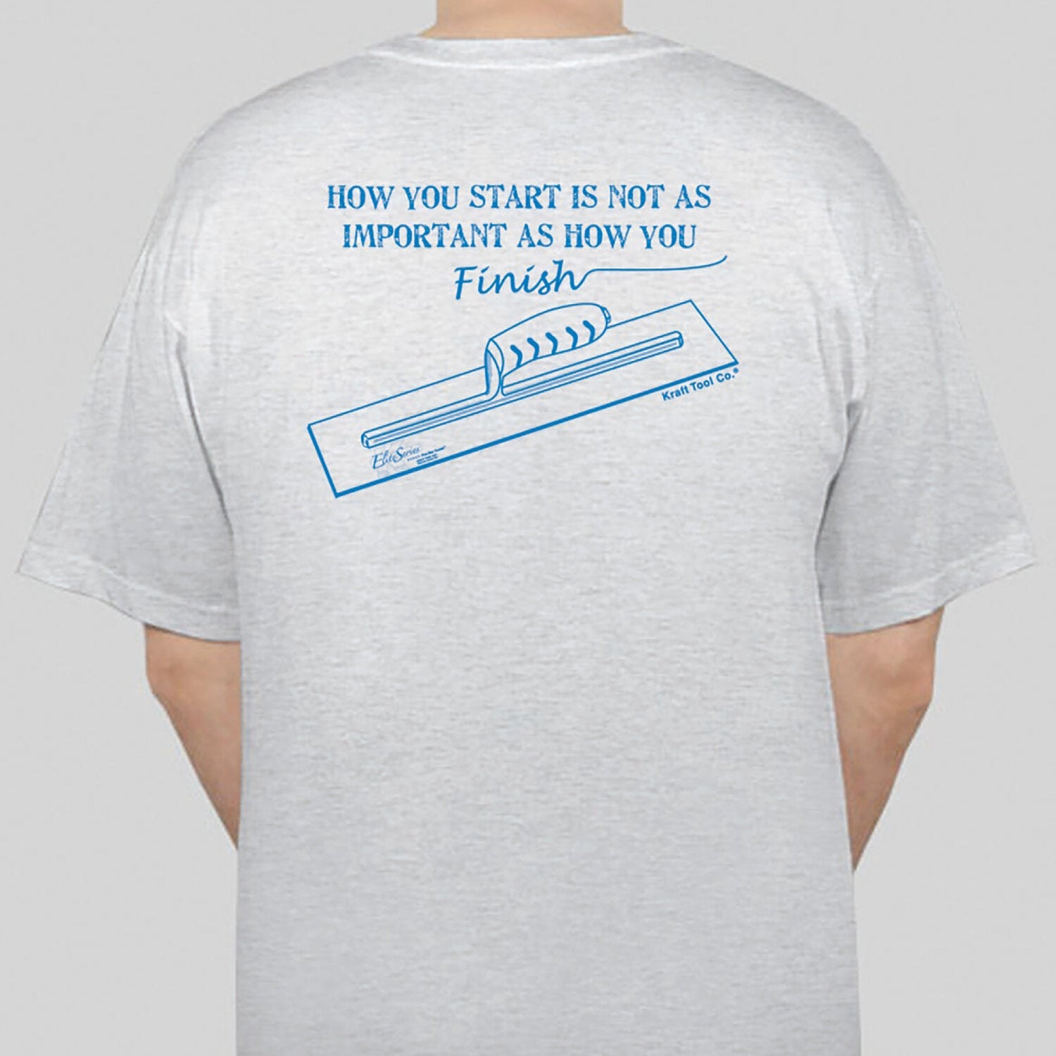 - "How You Start Is Not As Important As How You Finish" and trowel image in blue on the back