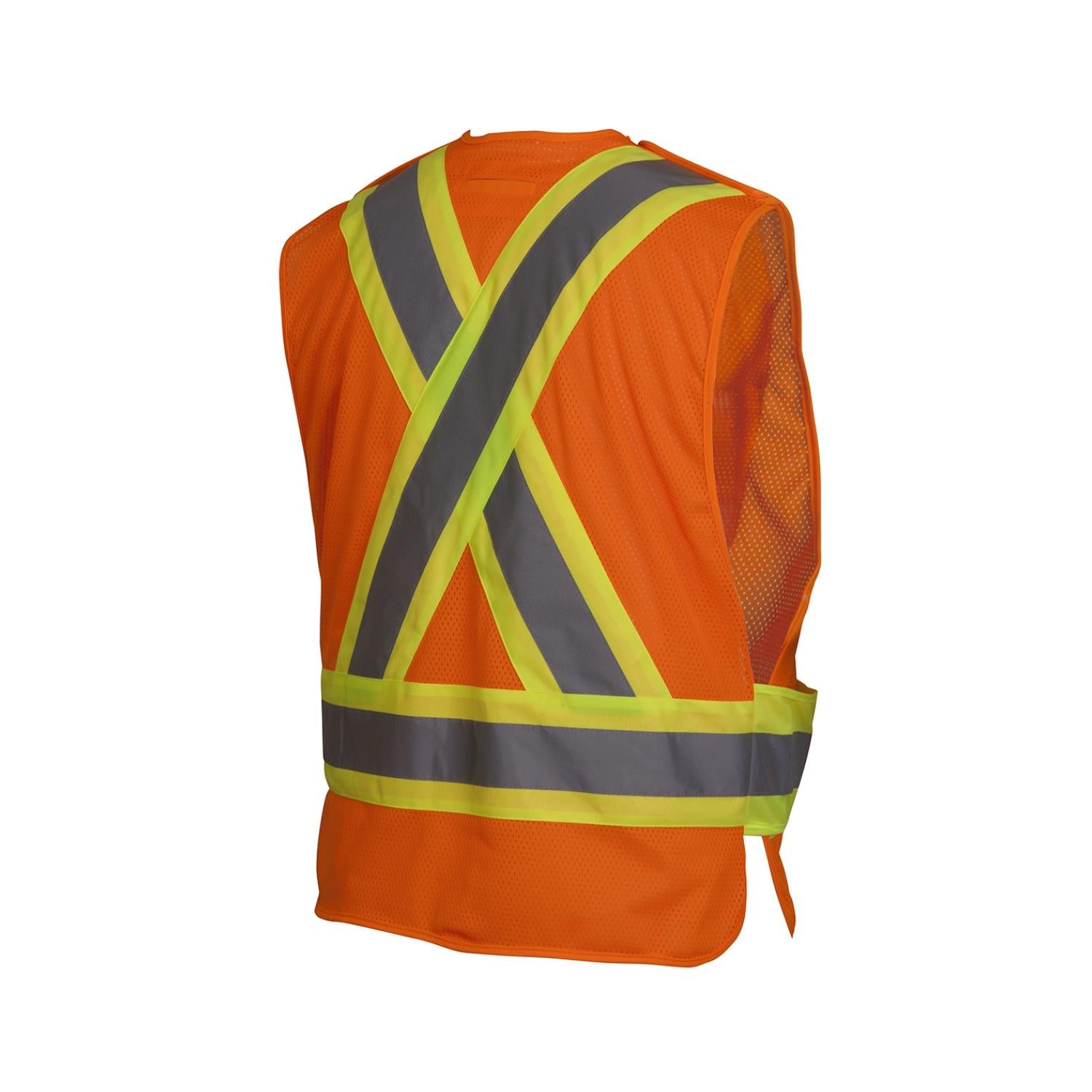 - 2'' silver reflective material with 4'' contrasting color trim around bottom and over shoulders, forming an "X" on the back