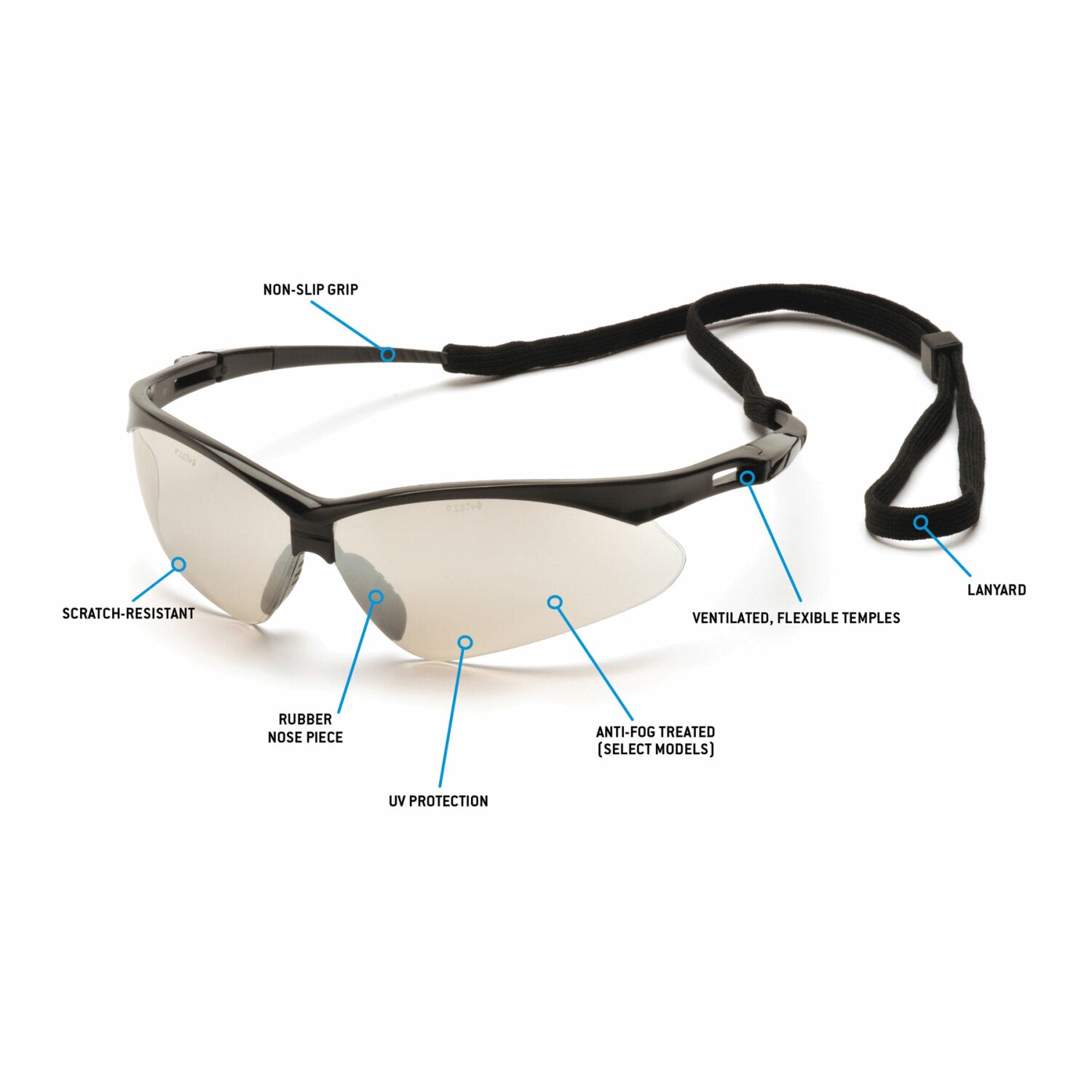 Pyramex - PMXTREME - Black Frame/I/O Mirror Lens with Black Cord - Includes black lanyard cord with rubber tips for extra security while wearing. Ventilated, straight-back flexible temples provide cool, pressure free fit. Rubber, temple tips keep eyewear secure for the active worker. 9 base curve polycarbonate lens provides maximum vision protection.