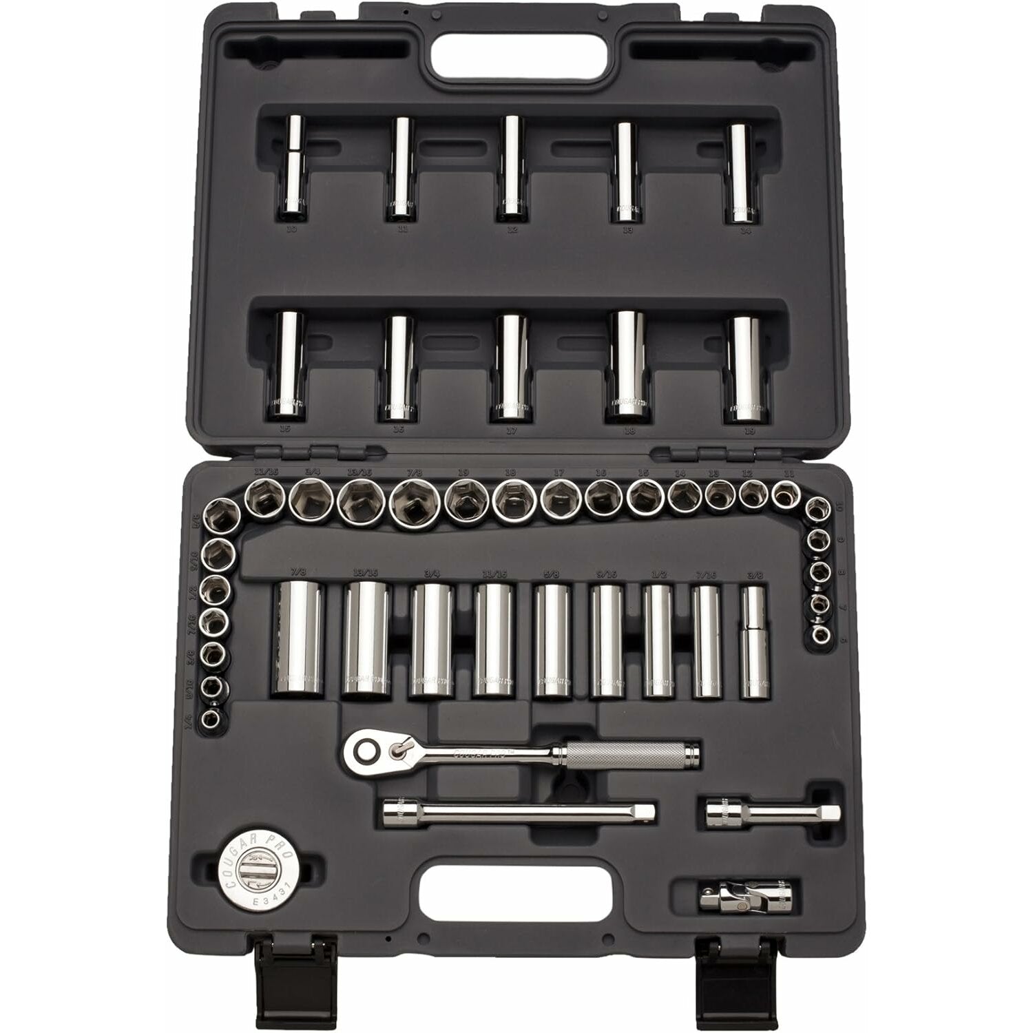3/8" Drive Set includes 6 Point Standard & Deep SAE & Metric Cougar Pro™ Sockets, Quick Release Ratchet, 3" & 6" Extensions, Universal & Thumbwheel Ratchet in molded plastic box.
