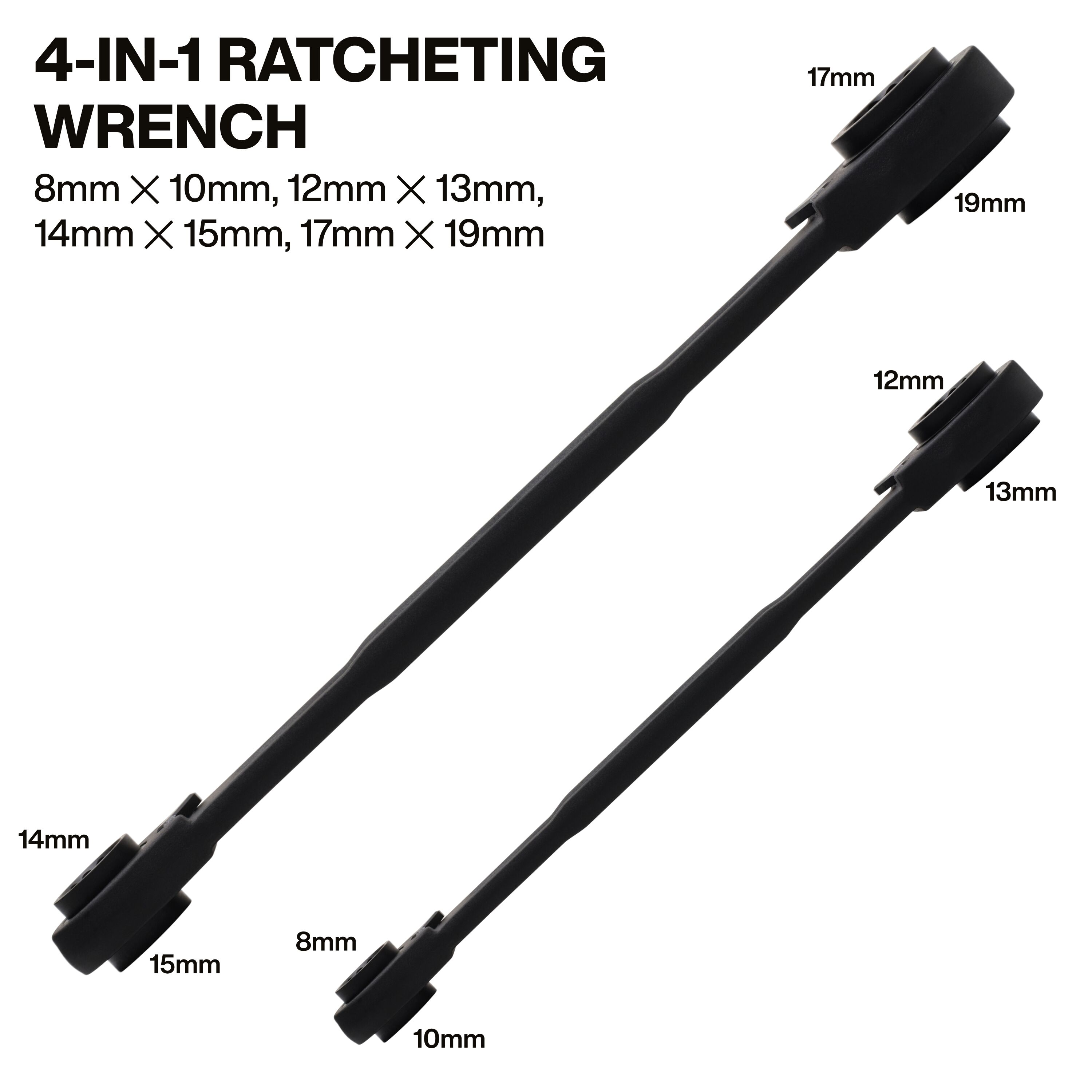 The Klein Tools 4-in-1 Ratcheting Wrench Set is a versatile box wrench set featuring two 12-point socket wrenches with eight Metric hex sizes, including 8mm x 10mm, 12mm x 13mm, 14mm x 15mm, and 17mm x 19mm. Features 90-tooth ratchet mechanism to minimize arc swing for access in tight spaces and a pass-through design accommodates longer threads. The reversing switches enable quick direction changes and ergonomic handles provide optimized comfort during extended use or repetitive tasks.