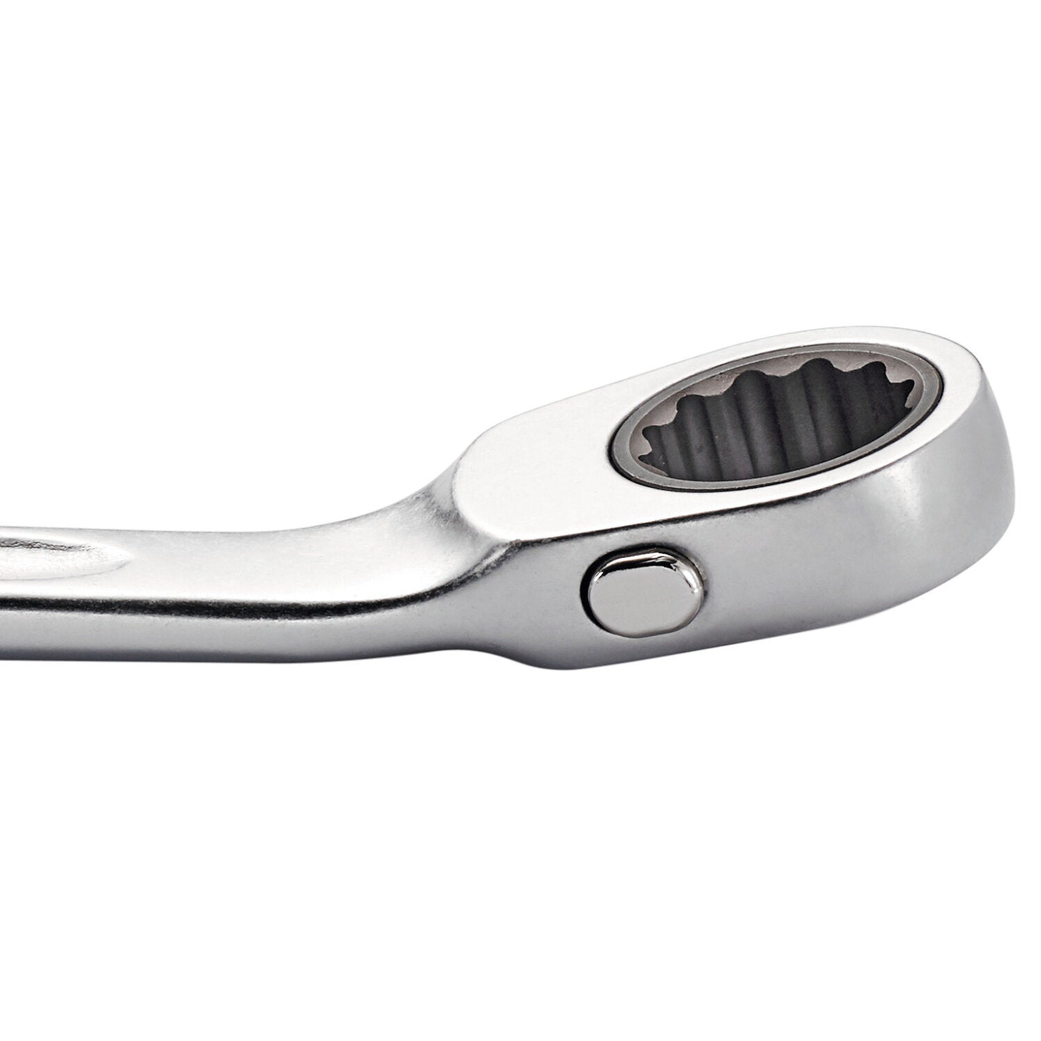 These premium metric combination ratcheting wrenches feature a 72-tooth ratchet for precise 5° movements and a 15° angled open end for improved access when tightening or loosening bolts. The practical ring switch allows easy direction changes, while the distinctive STAHLWILLE rounded finish provides a comfortable, secure grip for safe use, even with oily hands.
