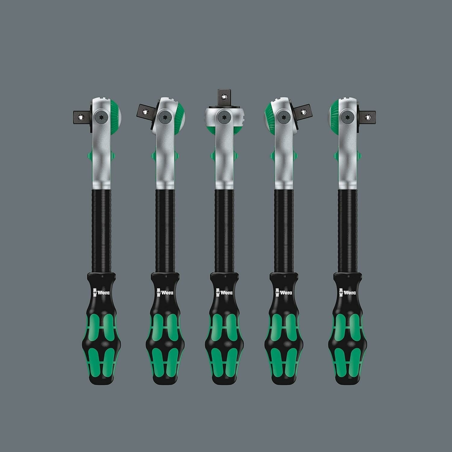 - Freely pivoting ratchet head with 5 predefined locking positions