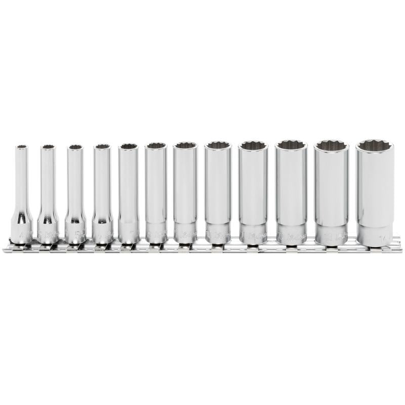 Ko-ken RS2305M/12 1/4"Sq. Dr. Socket set 4-14mm 12 point 12 pieces. 1/4" (6.3mm) square drive  12-point FLAT DRIVE® – Designed to guarantee a flat surface contact between the socket and bolt/nut to reduce wear and transmit a higher torque value Deep socket length provides additional reach Includes (12 pcs): (2305M) 4 · 5 · 5.5 · 6 · 7 · 8 · 9 · 10 · 11 · 12 · 13 · 14 mm With socket storage rail (200mm) Fine tolerances provide a snug, precise fitment on fastener heads.