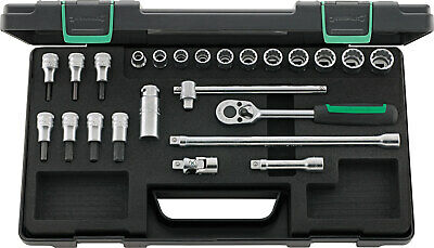 In sturdy, stackable ABS plastic case, 24 pieces Content: 11 sockets with bi-hexagon No 45: sizes 8; 10; 11; 12; 13; 14; 15; 16; 17; 18; 19 mm. 1 socket with bi-hexagon, long, with rubber insert No 4600: size 16 mm - 5/8" 7 INHEX sockets No 49: sizes 3; 4; 5; 6; 7; 8; 10 mm 1 ratchet No 435 2 extensions No 427/3 (76 mm), No 427/10 (240 mm) 1 T-handle No 425 1 universal joint No 428