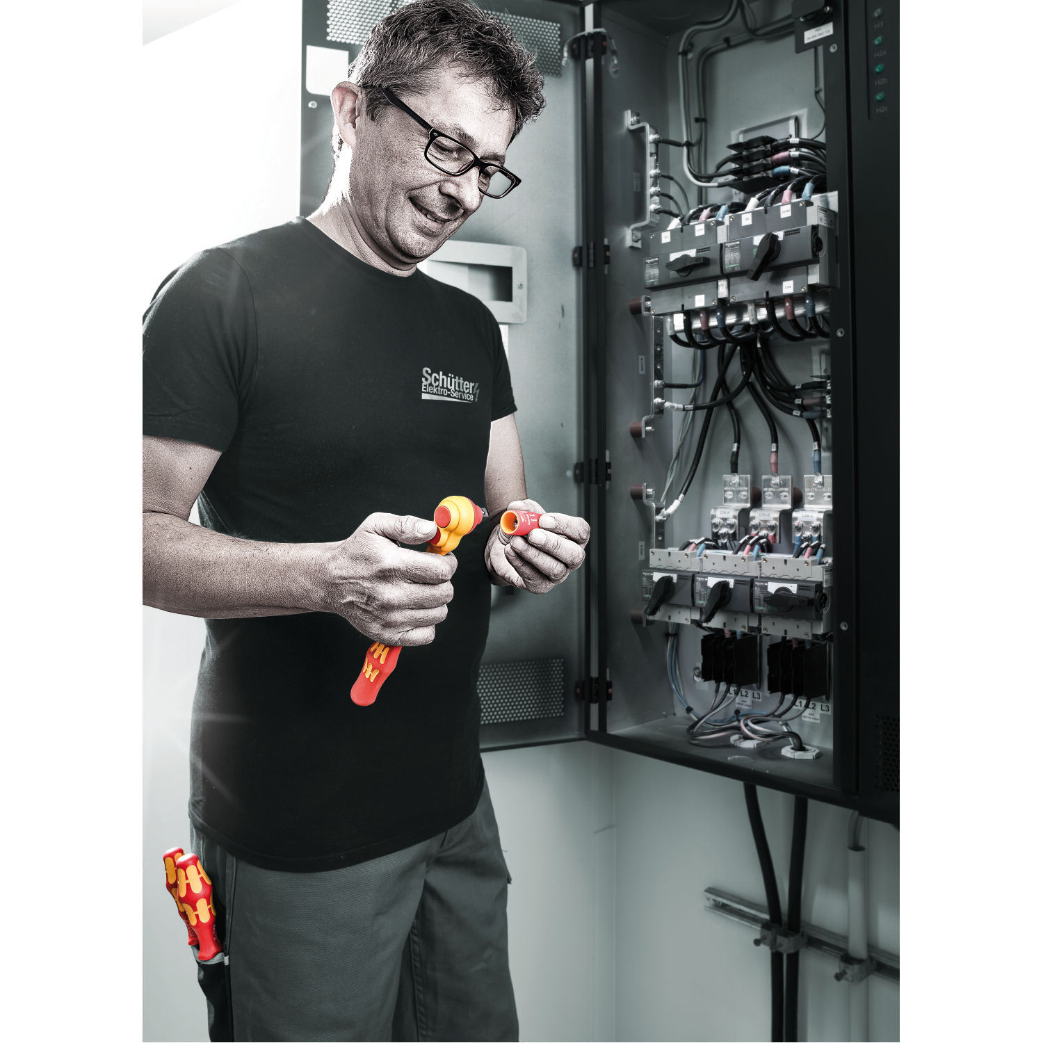 1/4" VDE sockets with increased safety thanks to the yellow insulation core, which becomes visible if the outer red VDE insulation layer is damaged. Individually tested tools as per IEC 60900 at 10,000 V for safe working at the approved voltage of 1,000 V.