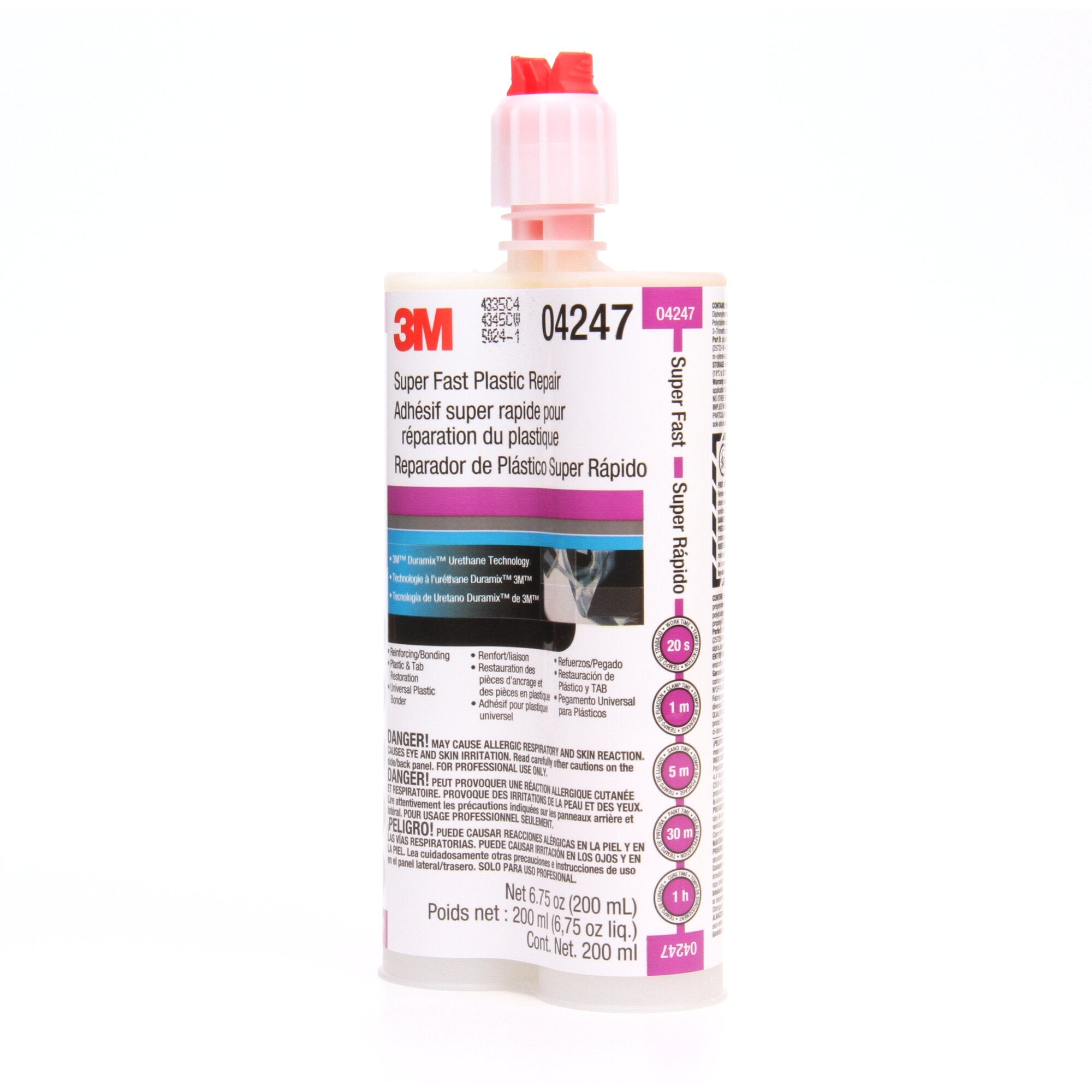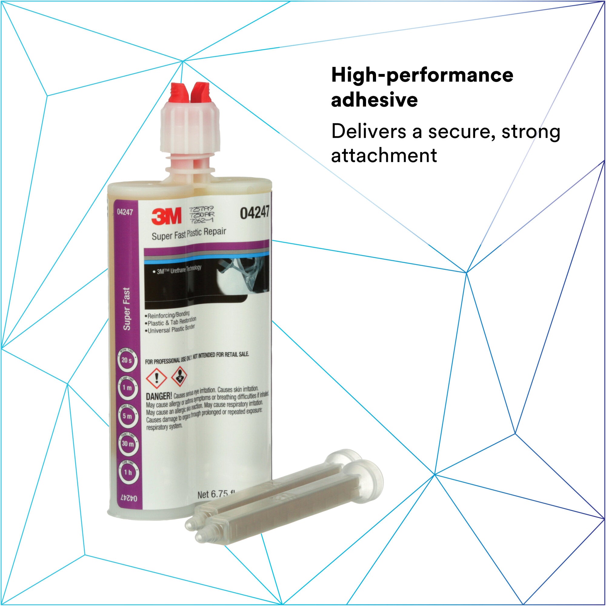 3M Super Fast Plastic Repair is a high-performance, two-component semi-rigid urethane adhesive that sets in about 20 seconds. This adhesive may be used to bond, restore and reinforce many types of plastic. This product is a popular choice for fixing or molding bumper tabs that break off.A Versatile Glue for Almost Any Plastic Substrate
