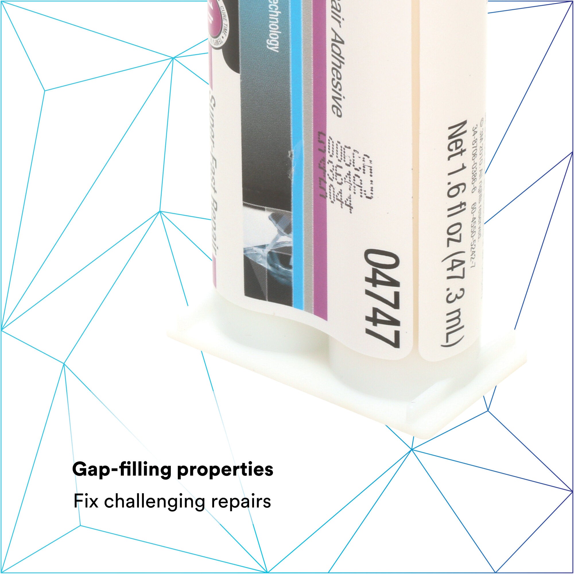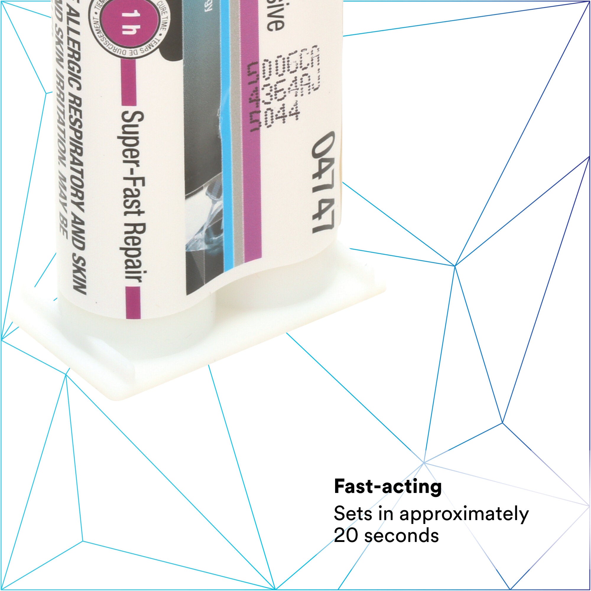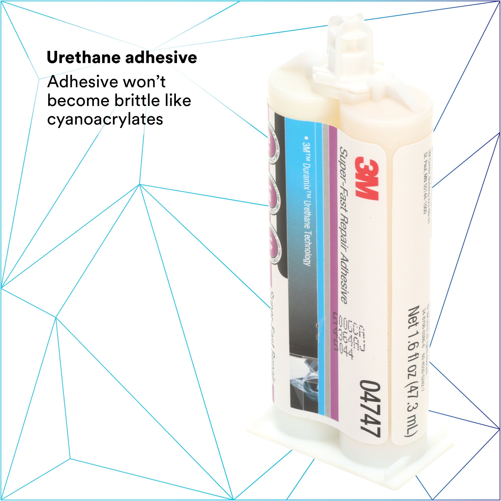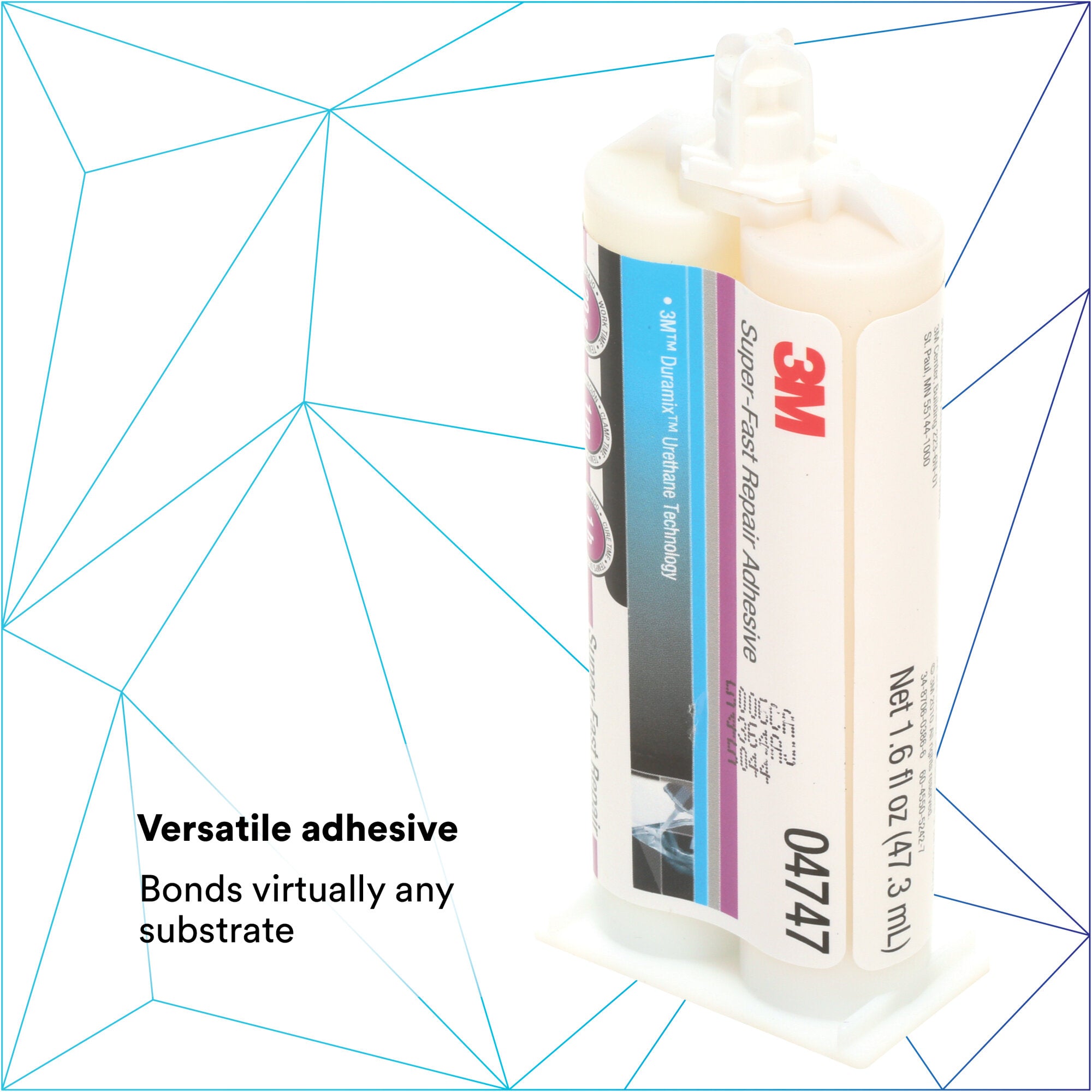 3M Super Fast Repair Adhesive is a high performance, two-component, semi-rigid, urethane adhesive. This fast-setting adhesive produces rapid results and offers excellent wide gap filling capabilities. This repair adhesive can be used for a variety of applications, does not run or sag and withstands a wide range of temperatures.Quick Bonds for Fast Repair
