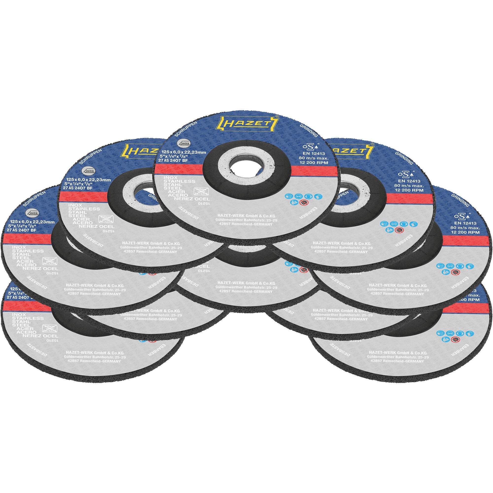 For cordless right-angle grinders 9233-7 ∙ 9233-7/4. 27 AS 24 O7 BF. Also suitable for stainless steel. Standards: DIN EN 12413 and oSa. Maximum rotation speed 12200 rpm. Maximum cutting speed 80 m/s. DIN EN 12413, oSa. Number of tools: 10.