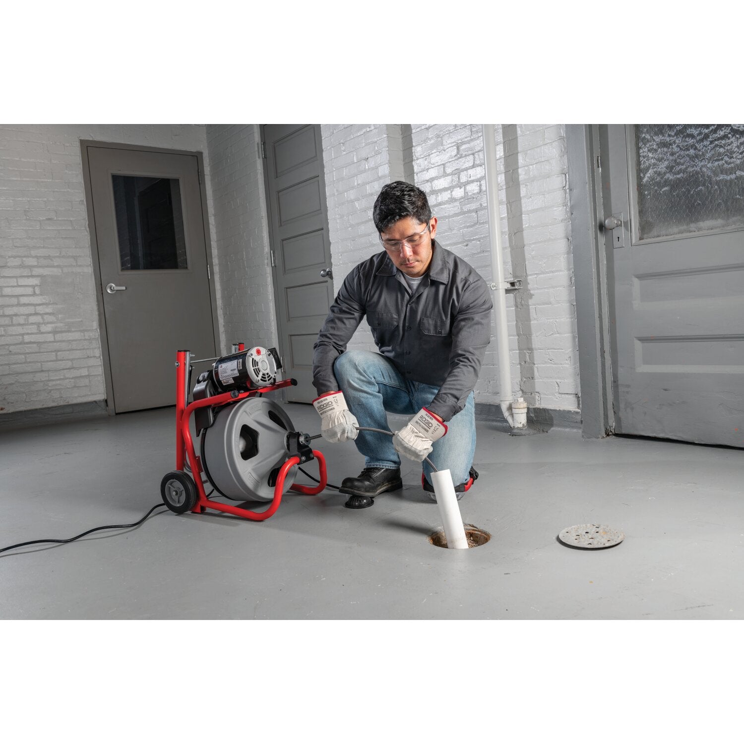 Introducing the K-400 Machine, a powerful drain cleaning solution from Ridgid, designed to handle drain lines from 1.5" to 4" in diameter. This complete unit features manual controls and comes equipped with a robust 75' solid core cable, corrosion-resistant drum, and a comprehensive T-260 tool set that includes essential cutting tools and gloves for user safety. Its integrated transport cart with large wheels makes mobility easy, while the innovative cable control system enhances safety by stopping the drum if obstructions occur. Backed by a full lifetime warranty, this machine ensures durability and reliability for tough plumbing jobs.