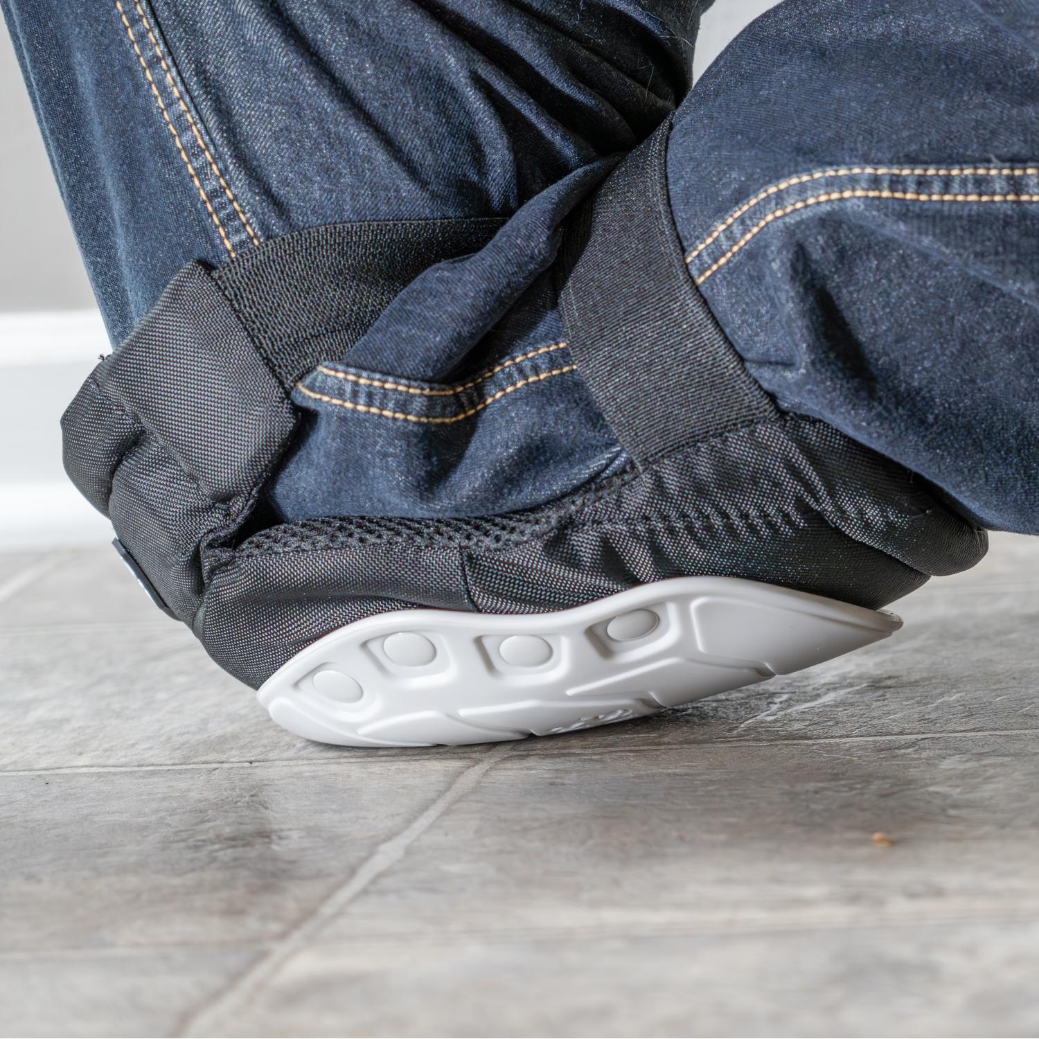 - Semi-hinged top strap positioned above the knee keeps the kneepad in place, with adjustable quick-fasten buckles for easy slipping on and off