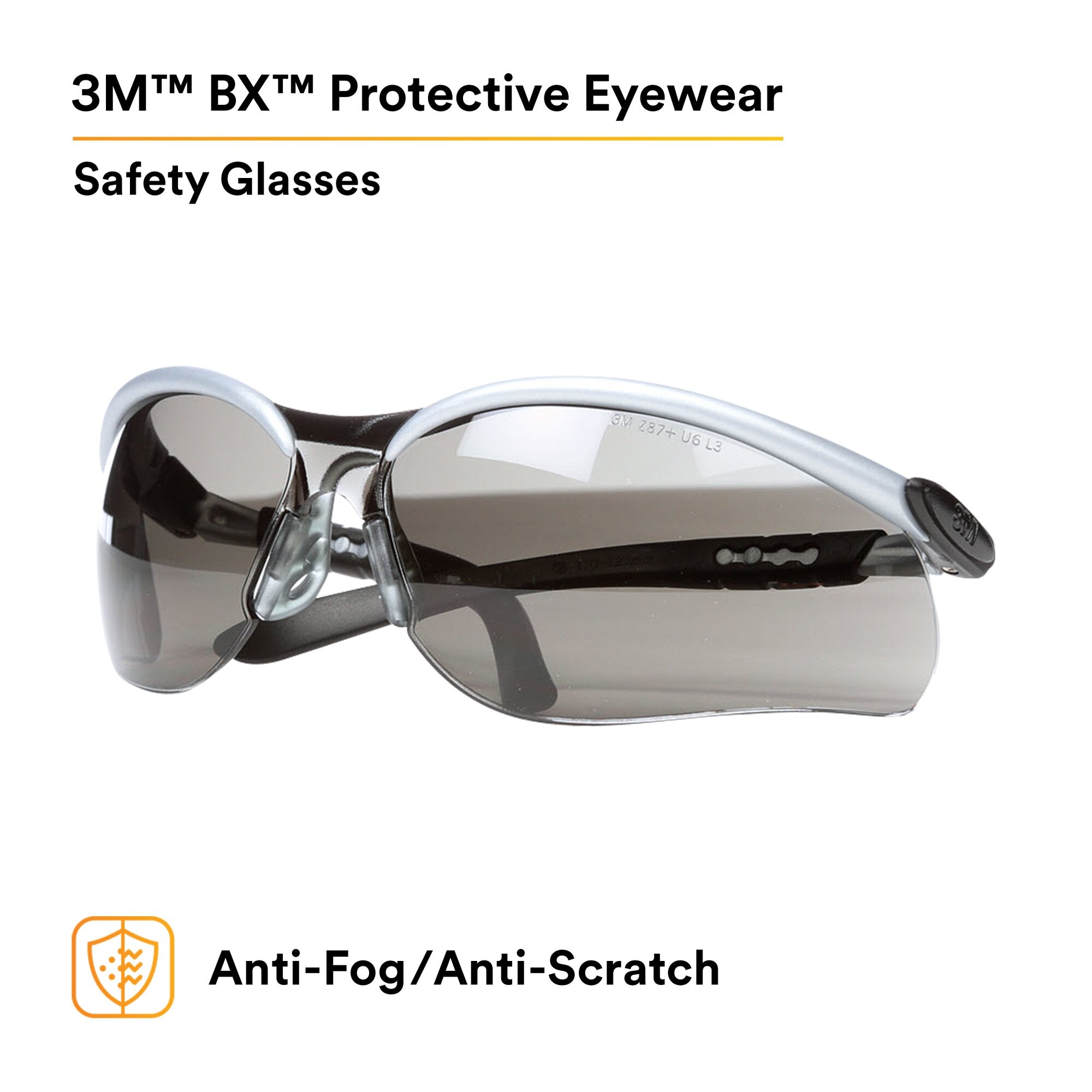 Sleek, contoured and fully adjustable protective eyewear, 3M™ BX™ features a soft adjustable nose bridge, lens angle adjustment, and adjustable length temples for extended wear.3M™ BX™ Protective Eyewear comes with an adjustable temple length, lens angle, and nosebridge to allow a more comfortable fit. The ability to customize the safety glasses to the wearer makes them more pleasant to use over extended time periods. The nose bridge is cushioned for softness and comfort. The sleek, contoured design offers an attractive appearance along with functional eye protection. The impact-resistant polycarbonate lenses absorb 99.9% UV rays. These safety glasses are recommended for following tasks: assembly and mechanical, chipping, chiseling, cleaning, drilling, grinding, machining, masonry, metal repair, painting, pouring/casting, power fastening, riveting, sanding and sawing. Industries in which these safety glasses are commonly used include aviation, construction, food and beverage, general manufacturing, mining, oil and gas, primary metals and transportation.