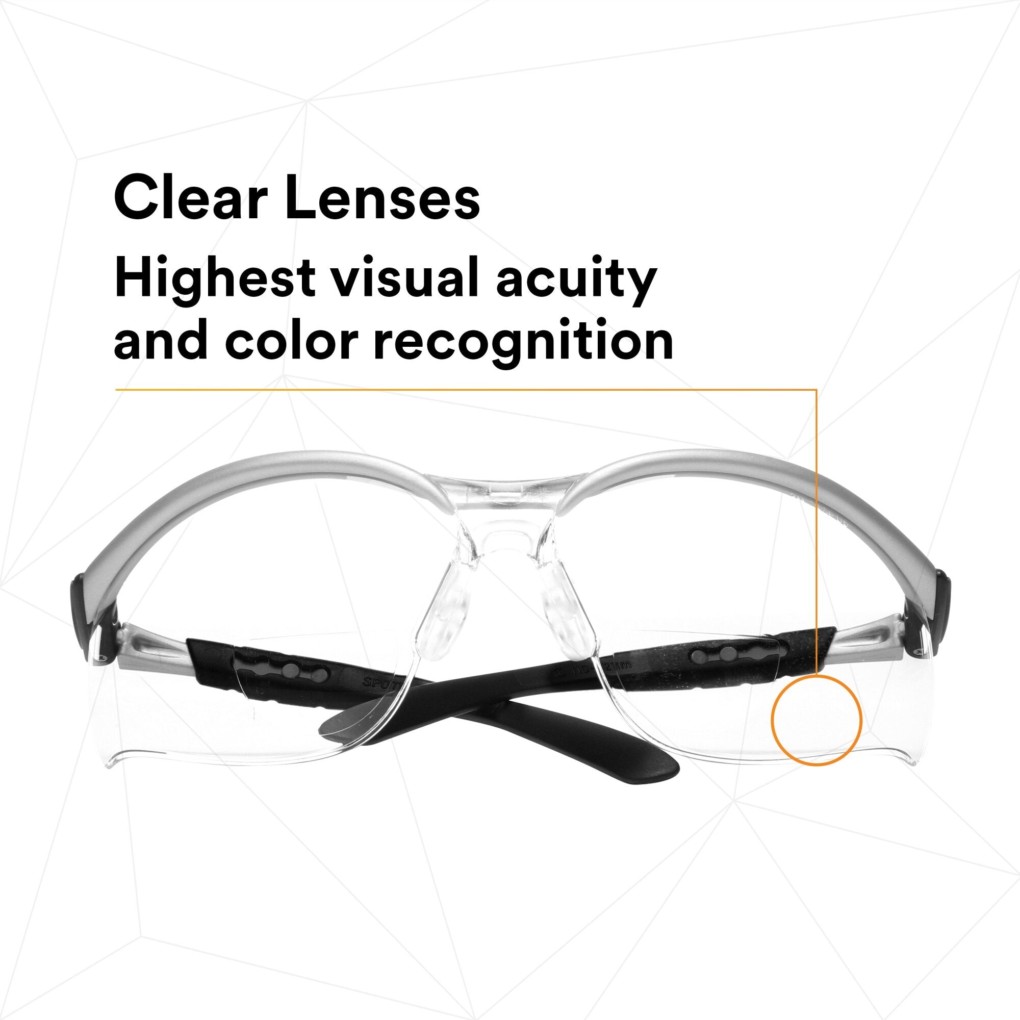 3M™ BX™ Protective Eyewear comes with an adjustable temple length, lens angle, and nosebridge to allow a more comfortable fit. The ability to customize the safety glasses to the wearer makes them more pleasant to use over extended time periods. The nose bridge is cushioned for softness and comfort. The sleek, contoured design offers an attractive appearance along with functional eye protection. The impact-resistant polycarbonate lenses absorb 99.9% UV rays. These safety glasses are recommended for following tasks: assembly and mechanical, chipping, chiseling, cleaning, drilling, grinding, machining, masonry, metal repair, painting, pouring/casting, power fastening, riveting, sanding and sawing. Industries in which these safety glasses are commonly used include aviation, construction, food and beverage, general manufacturing, mining, oil and gas, primary metals and transportation.