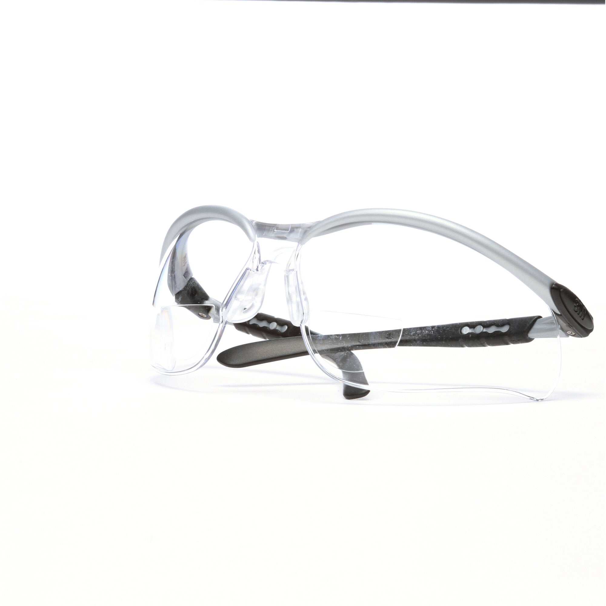 3M™ BX™ Reader Protective Eyewear features built-in magnifying diopters on the lower lenses to provides eye safety to workers who have difficulty reading small print or seeing small detail work. This protective eyewear comes with an adjustable temple length, lens angle, and nose bridge to allow a more comfortable fit. The ability to customize the safety glasses to the wearer makes them more pleasant to use over extended time periods. The nose bridge has also been cushioned for softness and comfort. The sleek, contoured design offers both an attractive appearance and functional eye protection. The impact-resistant polycarbonate lenses absorb 99.9% UV rays. These safety glasses are recommended for the following tasks: assembly and mechanical, chipping, chiseling, cleaning, drilling, grinding, machining, masonry, metal repair, painting, pouring/casting, power fastening, riveting, sanding and sawing. Industries in which these safety glasses are commonly used include aviation, construction, food and beverage, general manufacturing, mining, oil and gas, primary metals, and transportation.