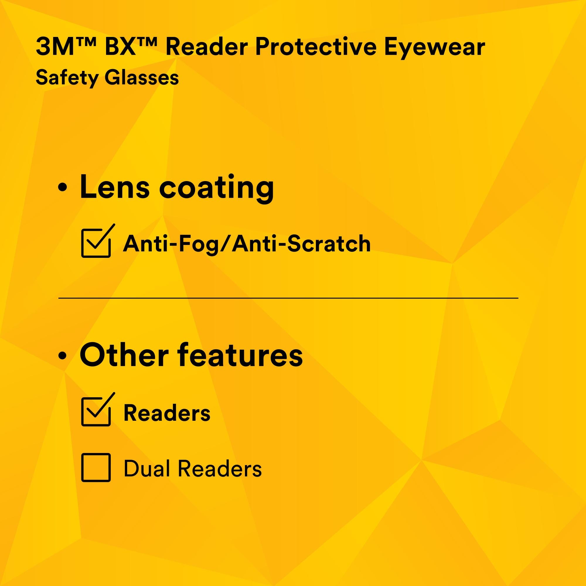 3M™ BX™ Reader Protective Eyewear features built-in magnifying diopters on the lower lenses to provides eye safety to workers who have difficulty reading small print or seeing small detail work. This protective eyewear comes with an adjustable temple length, lens angle, and nose bridge to allow a more comfortable fit. The ability to customize the safety glasses to the wearer makes them more pleasant to use over extended time periods. The nose bridge has also been cushioned for softness and comfort. The sleek, contoured design offers both an attractive appearance and functional eye protection. The impact-resistant polycarbonate lenses absorb 99.9% UV rays. These safety glasses are recommended for the following tasks: assembly and mechanical, chipping, chiseling, cleaning, drilling, grinding, machining, masonry, metal repair, painting, pouring/casting, power fastening, riveting, sanding and sawing. Industries in which these safety glasses are commonly used include aviation, construction, food and beverage, general manufacturing, mining, oil and gas, primary metals, and transportation. BX™ Reader safety glasses meet the requirements of CSA Z94.3 and ANSI Z87.1-2015. Eye protection is important to safeguard your eyes and maintain healthy vision. According to the Bureau of Labor Statistics, nearly three out of every five workers who suffered eye injuries were not wearing eye protection at the time of the accident. Wearing the correct safety eyewear for the task and for the unique needs of the worker is important. 3M™ recognizes the need to design comfortable and attractive eyewear, increasing the usage of safety glasses on the job. That’s why all 3M™ protective eyewear combines safety features with comfort enhancements.