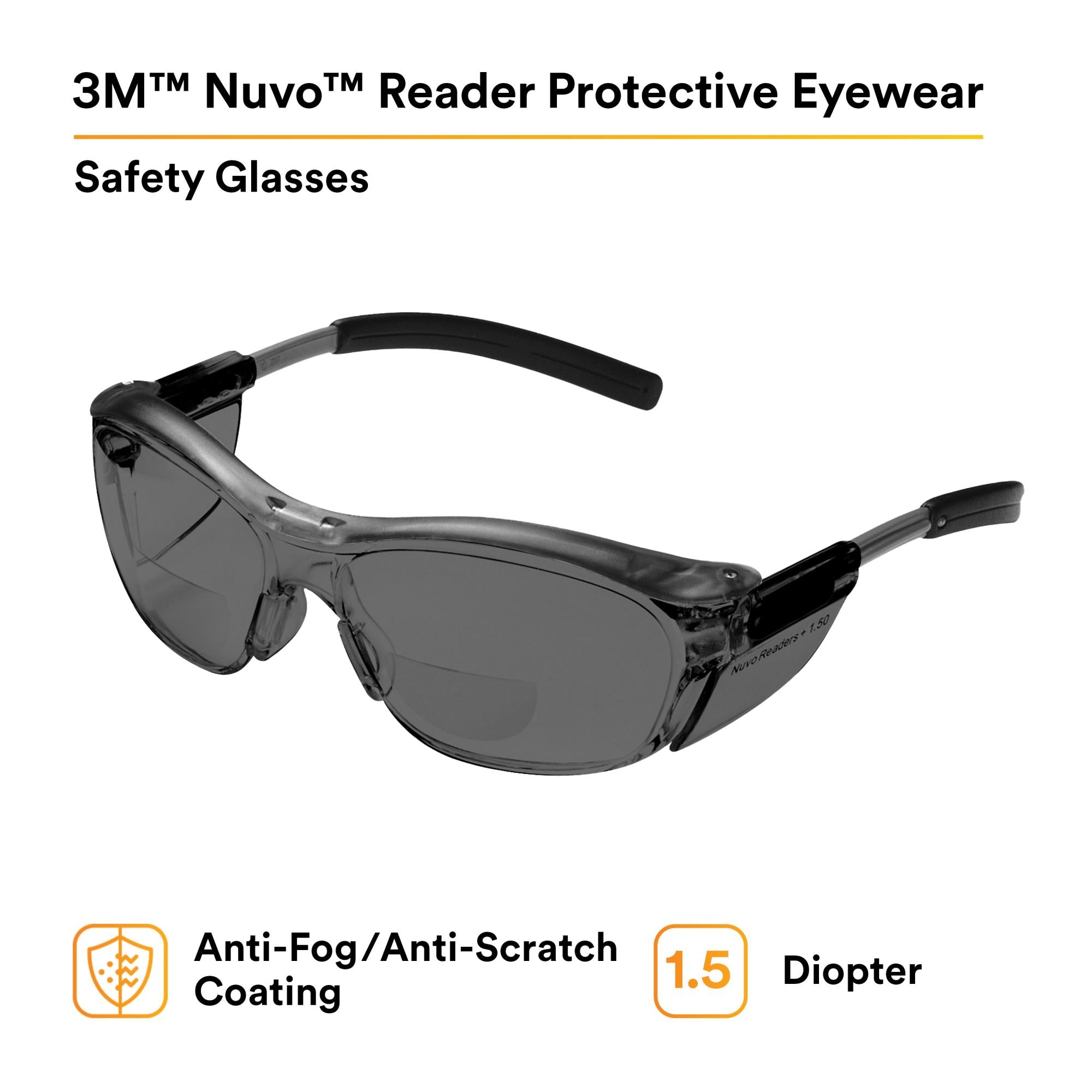 Lightweight, retro-styled Nuvo protective eyewear features adjustable temples, an integral brow bar and soft nosepiece. Contoured frame and sideshields offer additional comfort.3M™ Nuvo™ Reader Protective Eyewear features built-in magnifying diopters on the lower lenses to provides eye safety to workers who have difficulty reading small print or seeing small detail work. Characteristic of the Nuvo™ line, these glasses feature a distinct, nostalgic look with reliable eye protection that includes an integral brow bar and side shields for added coverage. The glasses appear to have a dual lens to make them look like standard glasses, but the lens is really a one-piece design for extra durability. The impact-resistant polycarbonate lens absorbs 99.9% UV rays. To enhance comfort, these safety glasses come with a soft nose bridge to cushion a high contact point. These safety glasses are recommended for the following tasks: chipping, chiseling, drilling, grinding, machining, masonry, pouring/casting, power fastening, riveting, sanding and sawing. Industries in which these safety glasses are commonly used include aviation, construction, food and beverage, general manufacturing, mining, oil and gas, primary metals and transportation.Nuvo™ safety glasses meet the high impact requirements of ANSI Z87.1-2015.
