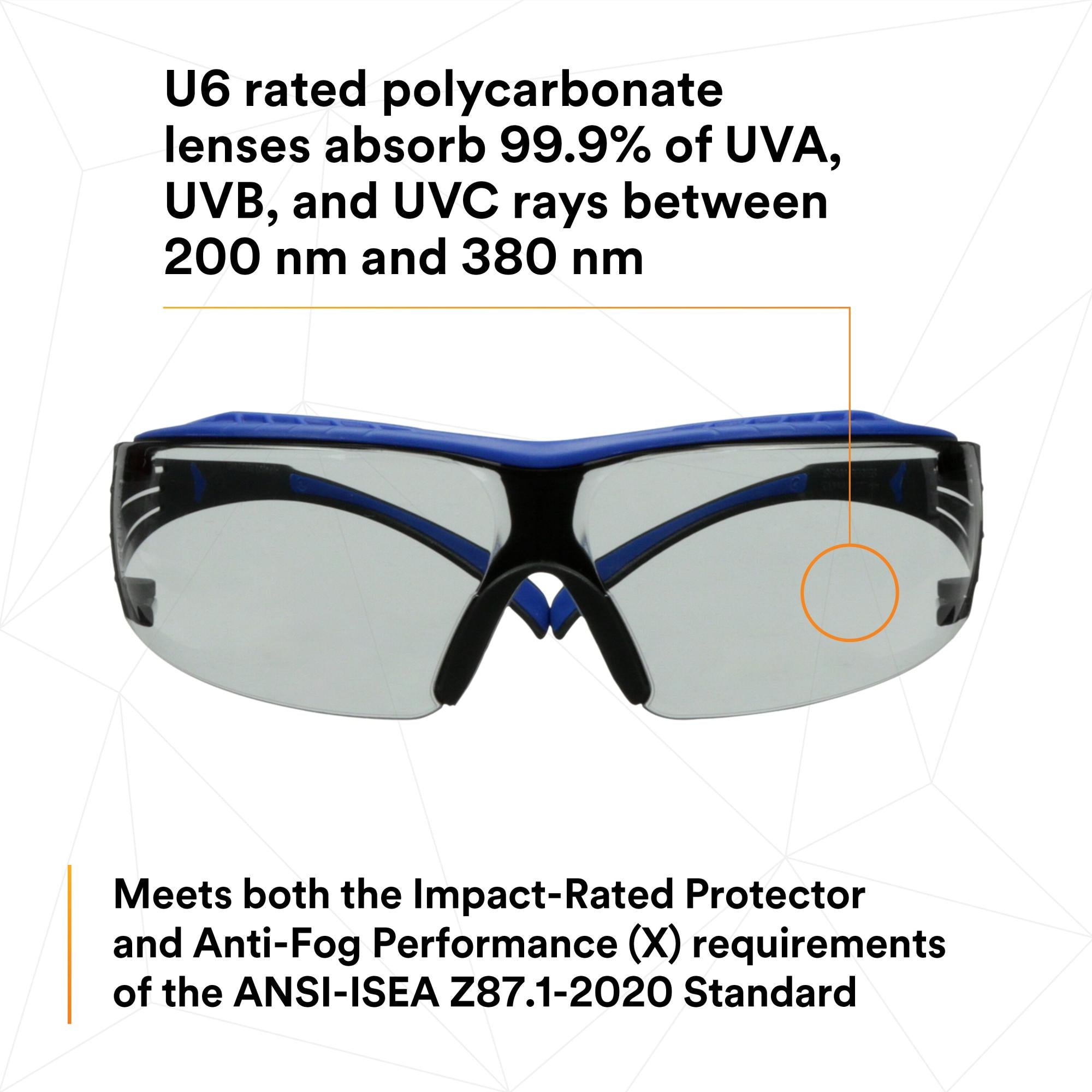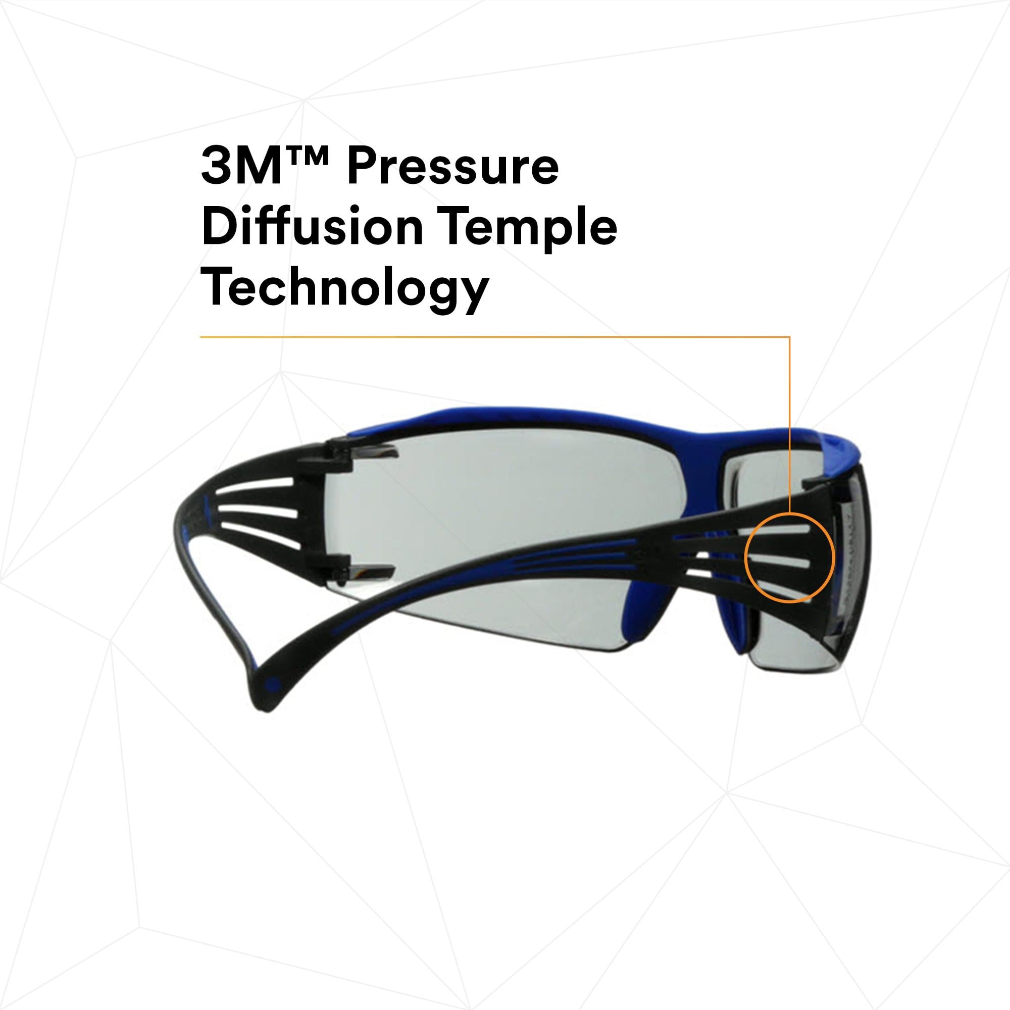 For lightweight eye protection designed for comfort and performance, use 3M SecureFit Safety Glasses 400X Series. Our safety glasses weigh just 22 g and have a contemporary, stylish look. 3M Pressure Diffusion Temple Technology offers a comfortable fit, with wide, flexible temple arms over the ears that provide solid side protection and padding for increased comfort. The soft nose bridge and contoured brow guard rest comfortably against the forehead to help provide additional protection from flying particles, and the wraparound design gives the user a wide field of vision as well as reducing slippage from head movements. These glasses combine well with ear muffs.