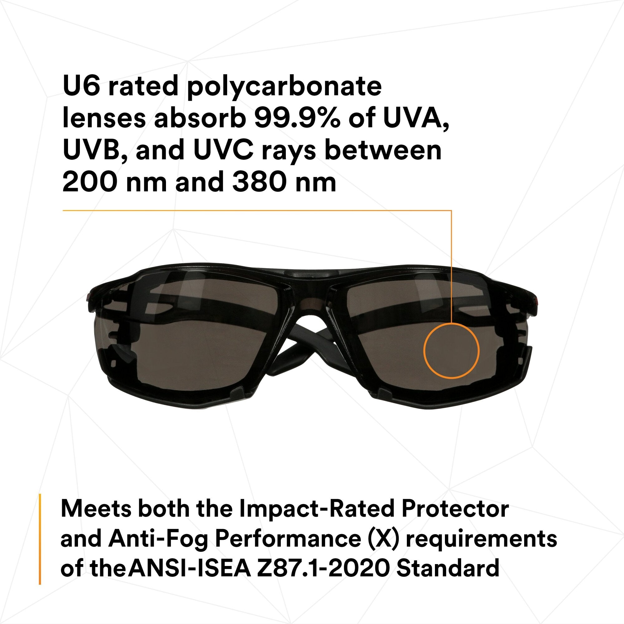 - U6 rated polycarbonate lenses absorb 99.9% of UVA, UVB, and UVC rays between 200 nm and 380 nm