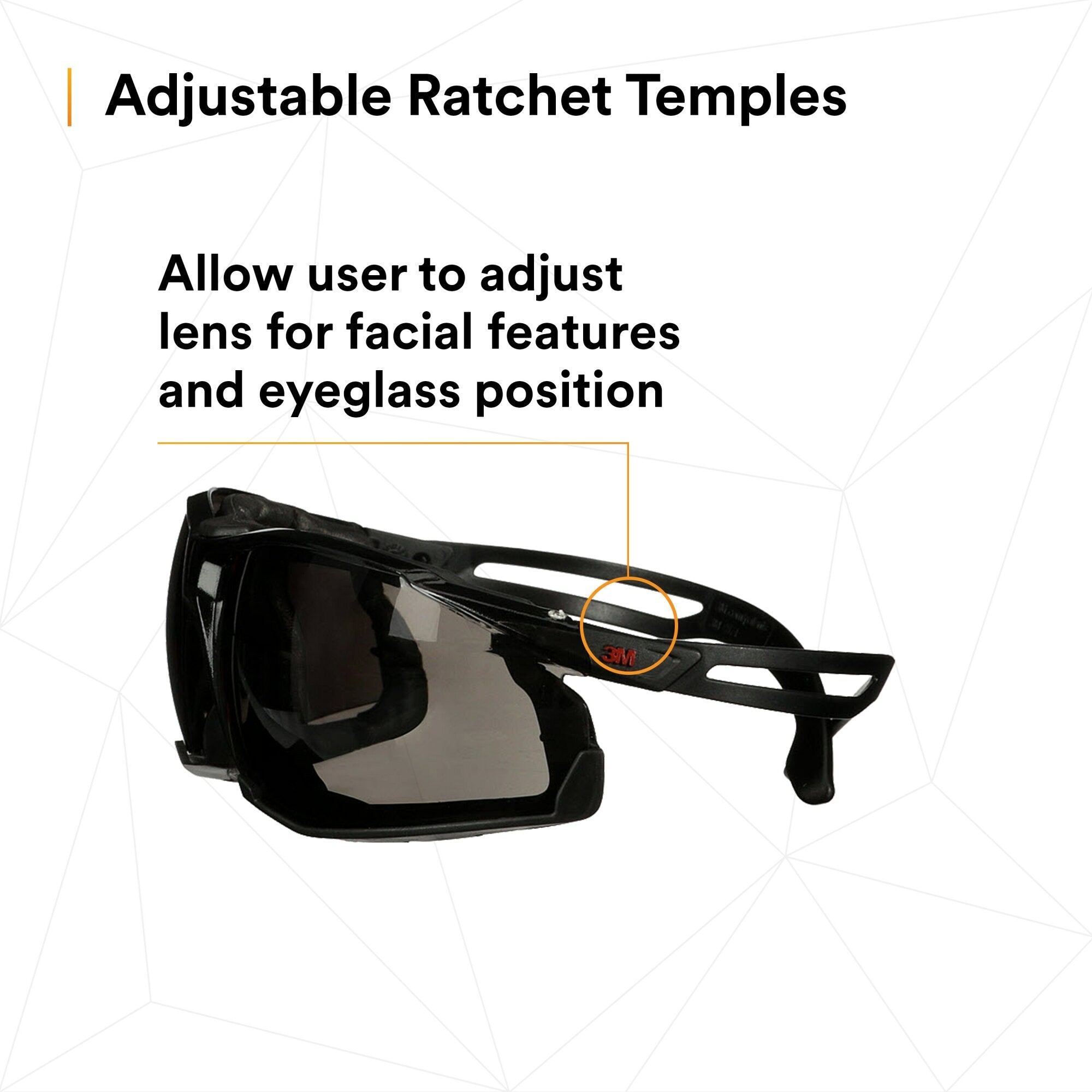 - Adjustable ratchet temples allow user to adjust the lens for facial features and eyeglass position.