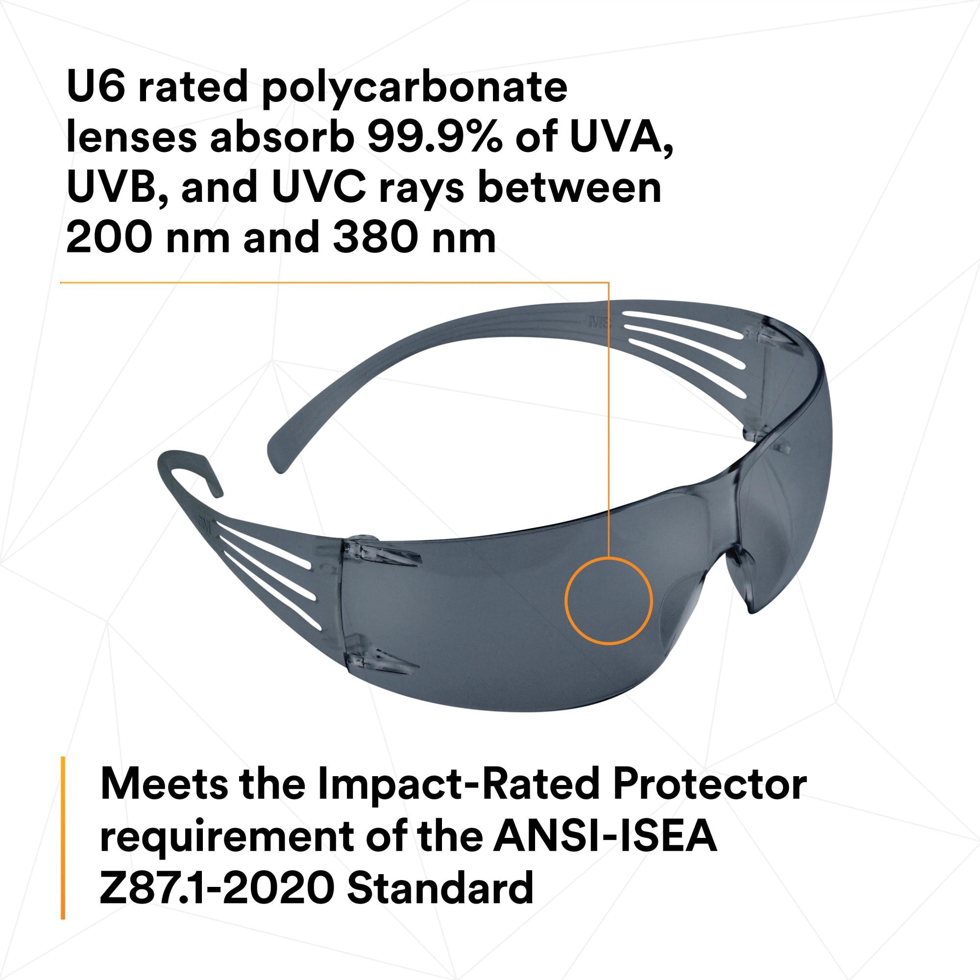 - U6 rated polycarbonate lenses absorb 99.9% of UVA, UVB, and UVC rays between 200 nm and 380 nm