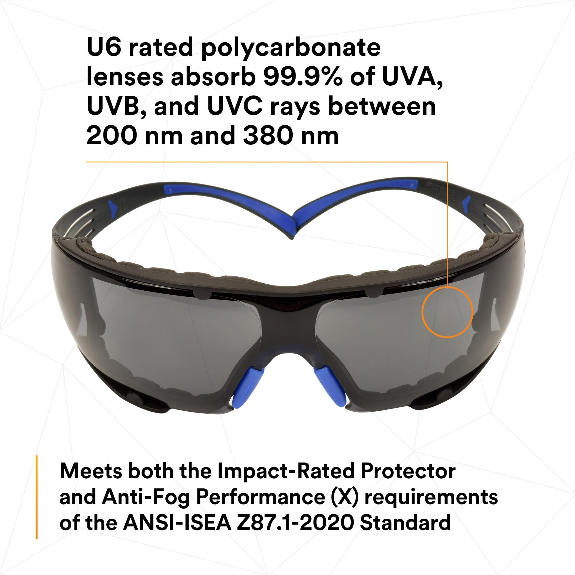 • U6 rated polycarbonate lenses absorb 99.9% of UVA, UVB, and UVC rays between 200 nm and 380 nm.