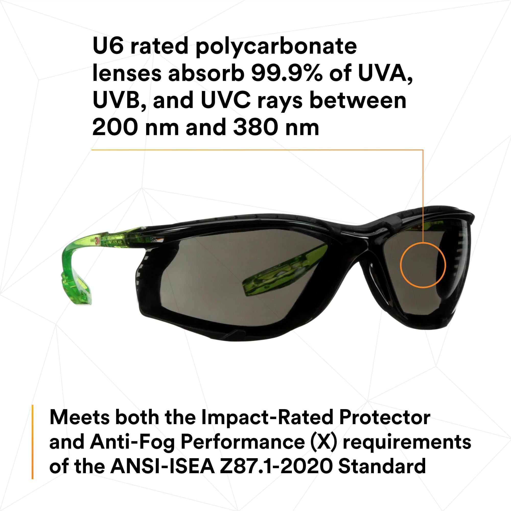- U6 rated polycarbonate lenses absorb 99.9% of UVA, UVB, and UVC rays between 200 nm and 380 nm