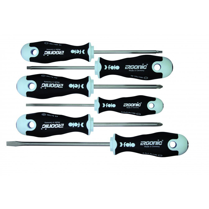 Felo 0715762755 Ergonic Inox Slotted Set includes Slotted, Pozidrive, Phillips & TORX®, 6 Piece