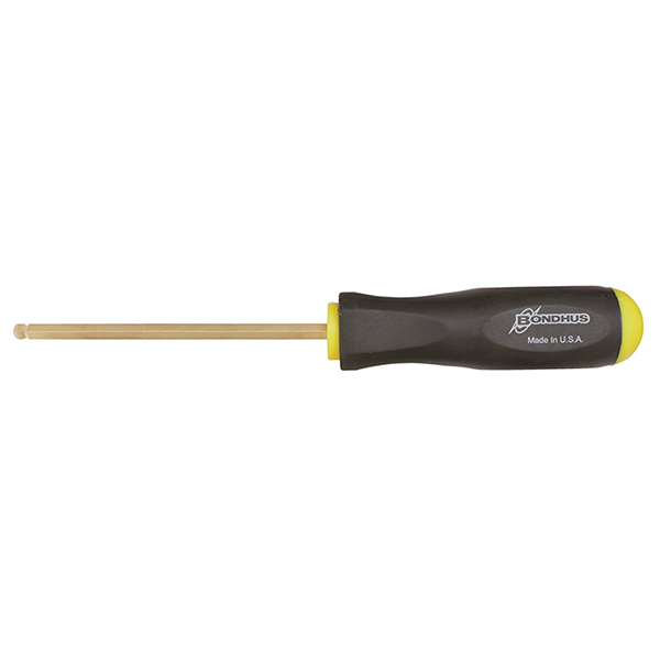 Blade Length: 2.8” Balldriver Screwdrivers feature ergonomically designed ComfortGrip handles. This handle includes a hard thermoplastic core for strength and split resistance, and a soft rubber outer coating to ensure maximum comfort and grip. Only available from Bondhus, Protanium(R) steel blades mean these are the strongest ballpoints available. These screwdrivers provide the greatest time savings for maintenance, assembly, and adjustment of hexagonal socket screws. The handles are proportioned to provide maximum torque without breakage. Ball End inserts into screw at a 25degree angle Ergonomic handle design, Non-slip grip Two component handle with tough inner core and cushioned rubber exterior Anti-roll design