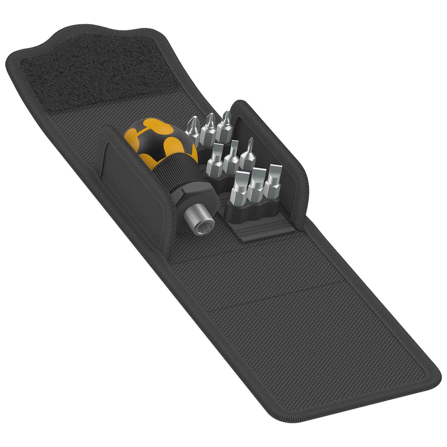 Handle/interchangeable blade system for lightning fast replacement of the required blade. Especially small ESD bit-holding Stubby screwdriver handle with short blade for eloctrostatically secure working even in hard to reach areas. Suitable for the mounting of bits with ¼" hexagon drive as per DIN ISO 1173-C 6.3 and Wera connection series 1. With strong permanent magnet, which also holds large and heavy screws. The 2-component Kraftform handle with its practical combination of hard and soft zones allows for a firm grip and precise working. High-quality bits for universal use. Compact, textile box with high robustness, low weight and volume. Suitable for docking with the Wera 2go system.