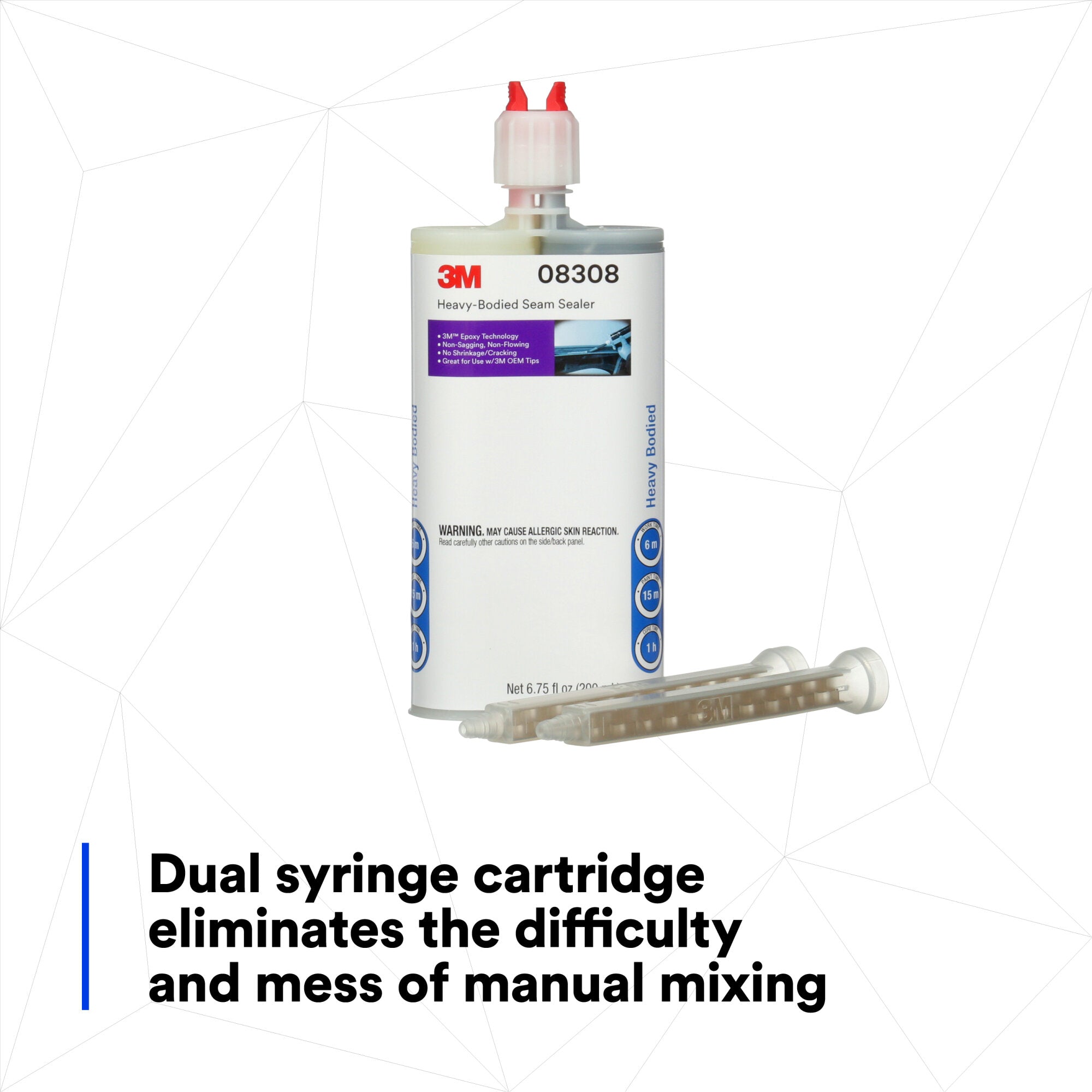 3M™ Heavy-Bodied Seam Sealer in 200 mL cartridges (PN 08308) can be used with the following 3M™ Applicators: PN 08117 (manual), PN 08571 (manual), and PN 09930 (pneumatic) Also use the 3M™ Mix Nozzle: PN 08193 (6/bag), PN 8194 (50/box).