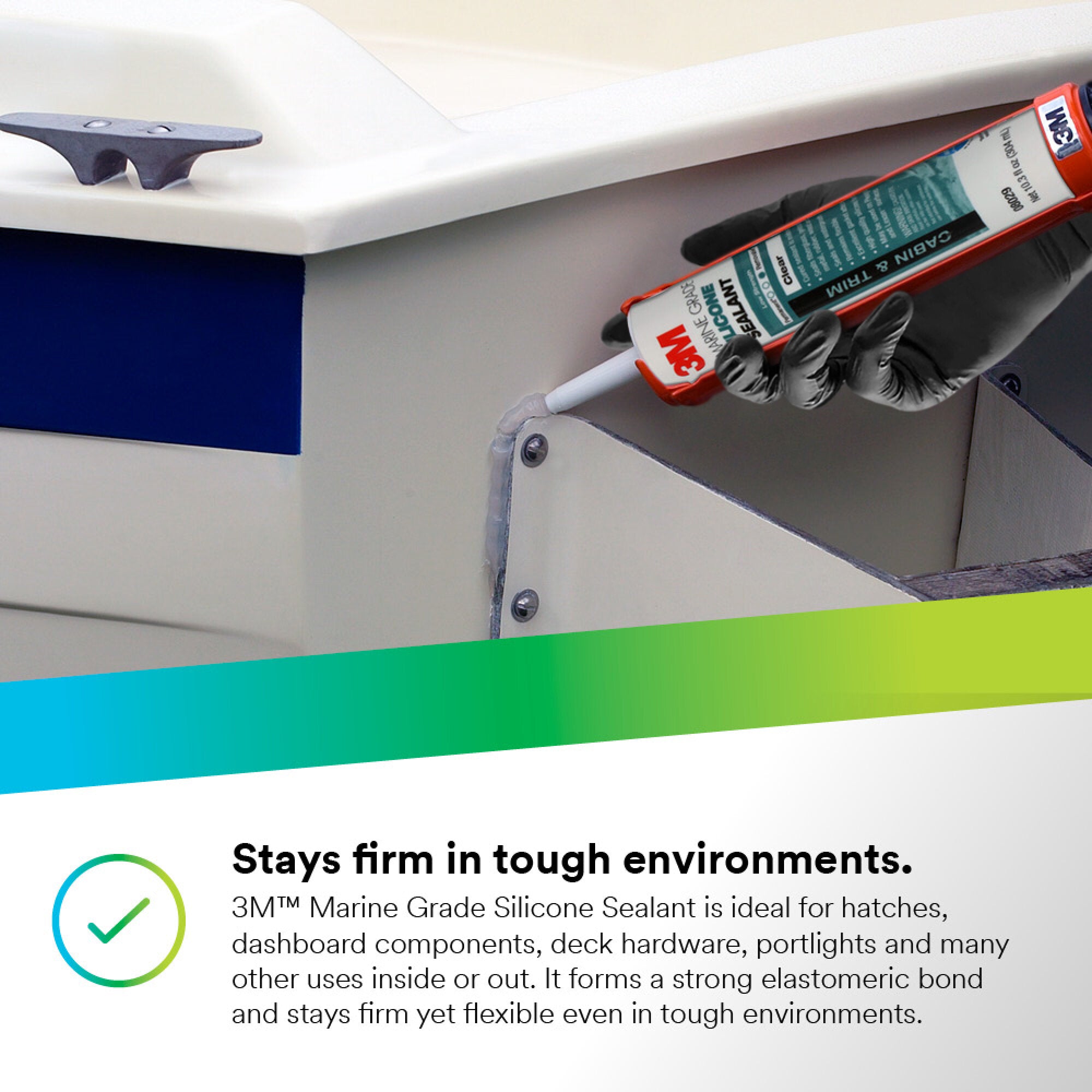 3M™ Marine Grade Silicone Sealant is a part of a broad range of adhesive sealants uniquely formulated for the marine market. 3M™ Marine Grade Silicone Sealant is designed for reliable sealing performance in harsh marine environments.