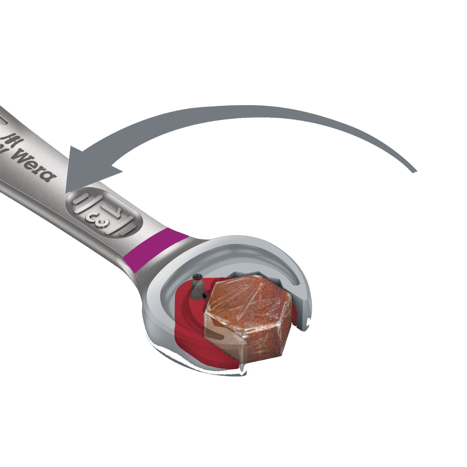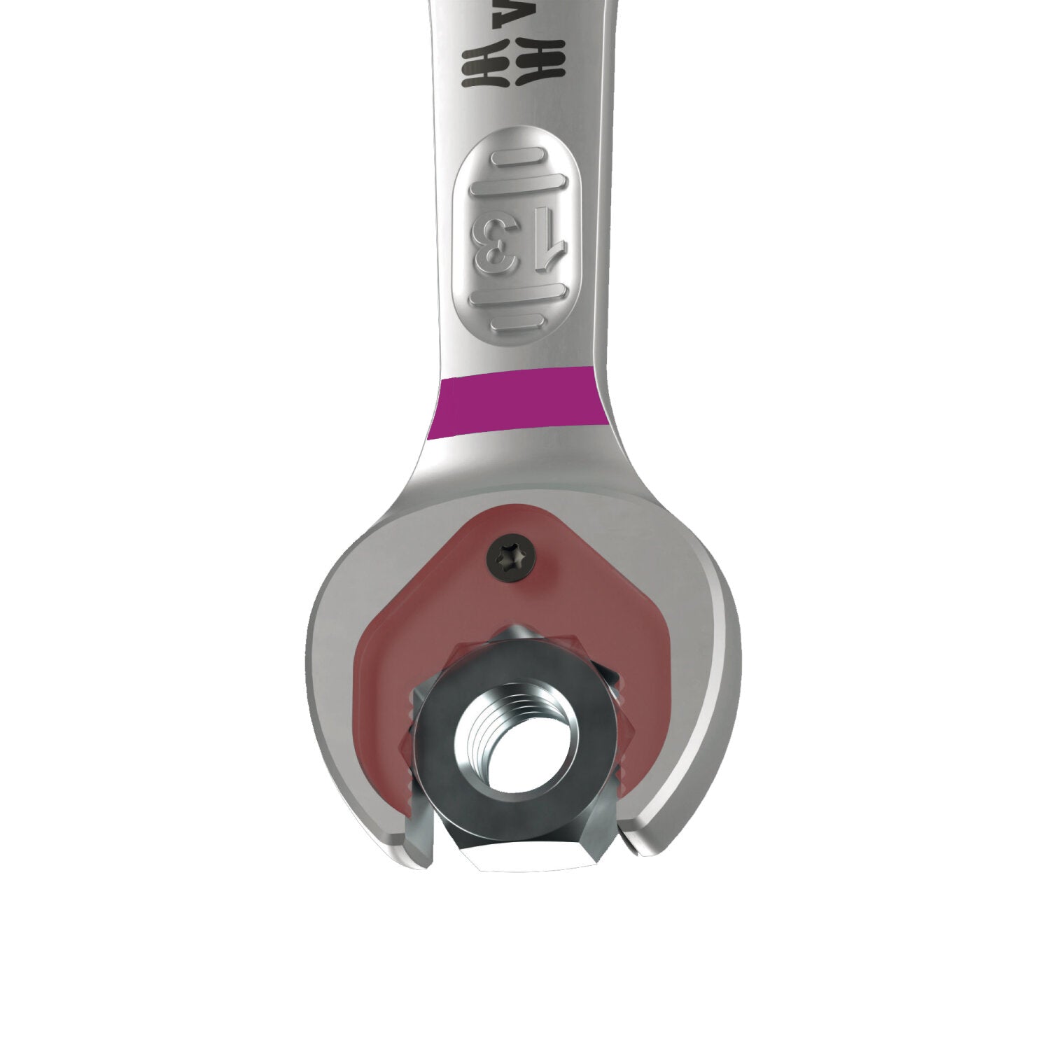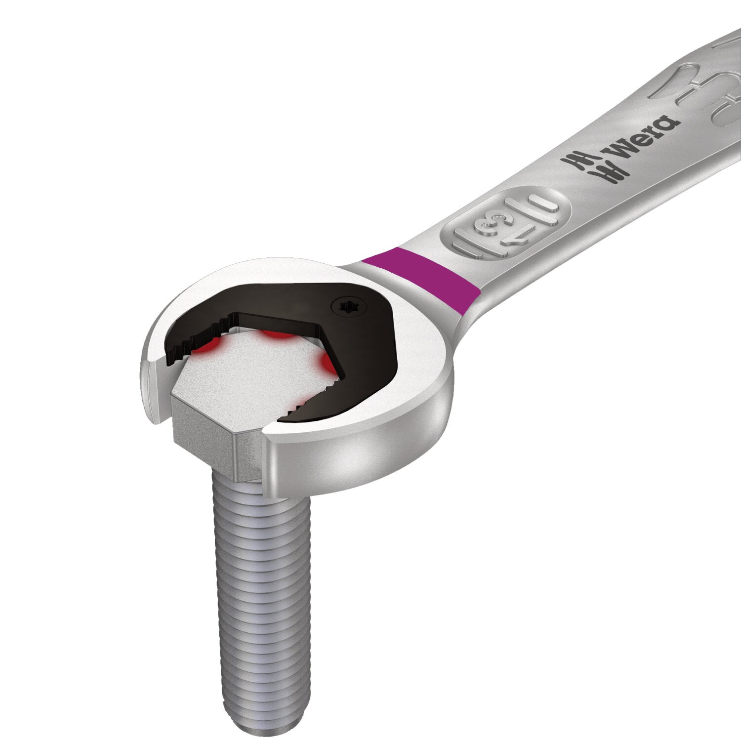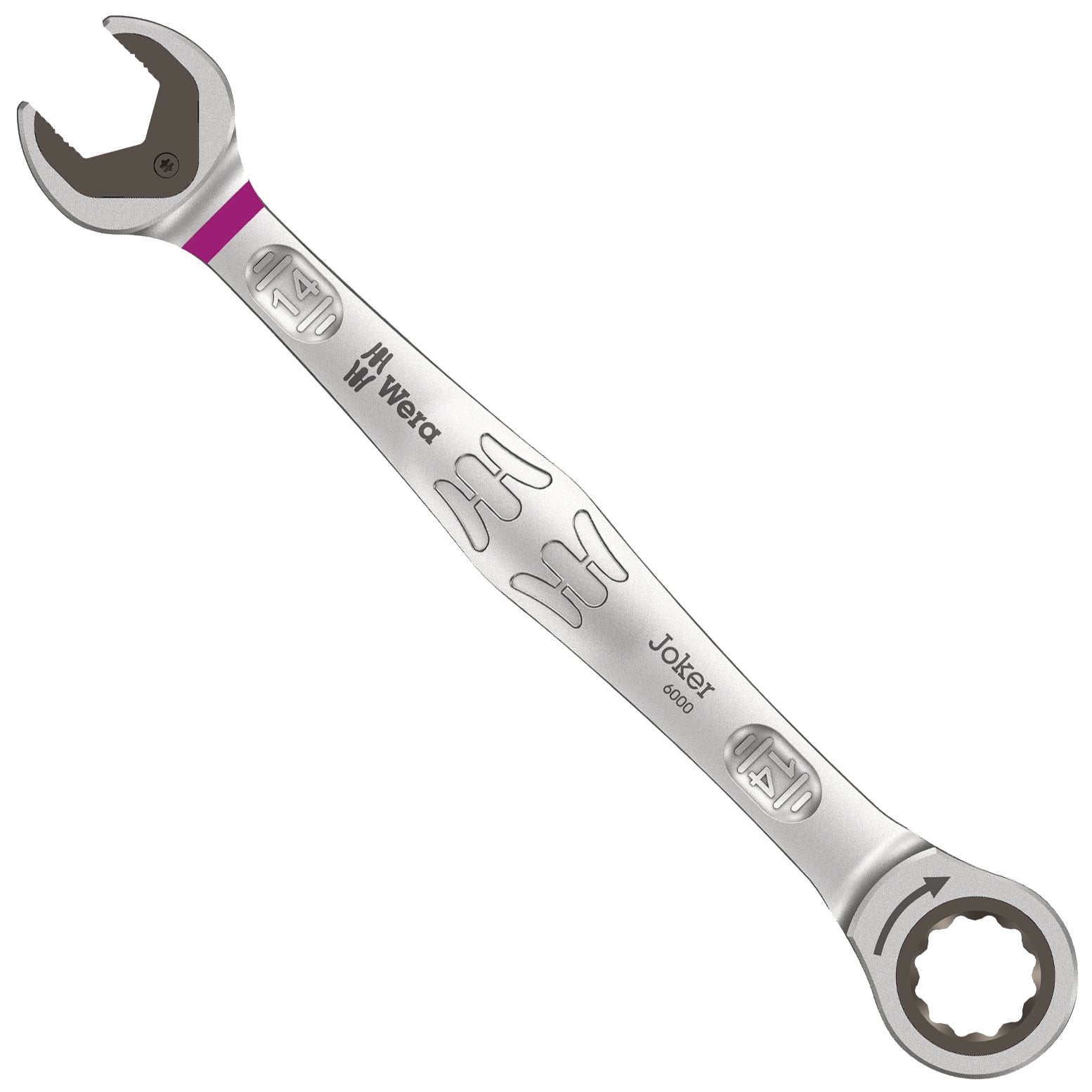 Premium metric ring ratchet spanner by Wera: Everything a wrench can do and so much more. Faster, better, more beautiful. A real Joker! The new generation of ring ratchet spanners. For hexagon screw heads and bolts. With holding function enabled by a metal plate in the mouth, which reduces the risk of losing screws and sockets. With its extra hard teeth the exchangeable metal plate in the mouth secures screws and sockets and reduces the risk of slipping. The integrated end stop can prevent the screw head from slipping down and allows application of high torques. The double hexagon geometry ensures a positive connection with the screw or bolt and thus reduces the risk of slipping. A back-pivoting angle of only 30° at the mouth side avoids time-consuming rotating of the wrench whilst screwdriving. Ratchet mechanism at the ring side with exceptionally high fine toothing of 80 teeth for flexibility even in confined spaces. The specially engineered geometry allows a high torque transmission and high bending stiffness. Made of high-performance chromium molybdenum steel with nickel-chromium coating for high corrosion protection. With tool finder "Take it easy": colour coding by size.