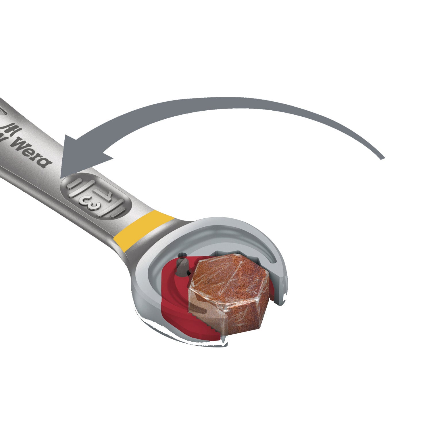 High quality, imperial, combination ratchet wrench by Wera. Everything that a wrench has to be able to do. And a whole lot more. Faster, better, stylish. Yes, a real Joker. The new generation of combination ratchet wrenches. Suitable for hexagon socket screws, bolts or nuts. Comes with holding function, thanks to the metal plate in the jaw, which reduces the risk of dropping nuts and bolts. The replaceable metal plate in the jaw secures nuts and bolts with its extra hard teeth and reduces the danger of slipping. The integrated limit stop prevents any slipping around the bolt head and allows higher torque to be applied. The double-hex geometry makes for a positive connection with nuts or bolts and reduces the risk of slipping. A return angle of only 30° at the open end prevents any time consuming flipping of the wrench. The ratchet mechanism at the ring end, with an exceptional, fine-tooth mechanism - 80 teeth in all - enables flexibility even in very confined working spaces. The specially forged geometry ensures high torque transfer and strength. The ratchet is manufactured out of high performance chrome molybdenum steel with nickel-chrome coating for high corrosion protection. "Take it easy" Tool Finder with colour coding according to sizes.