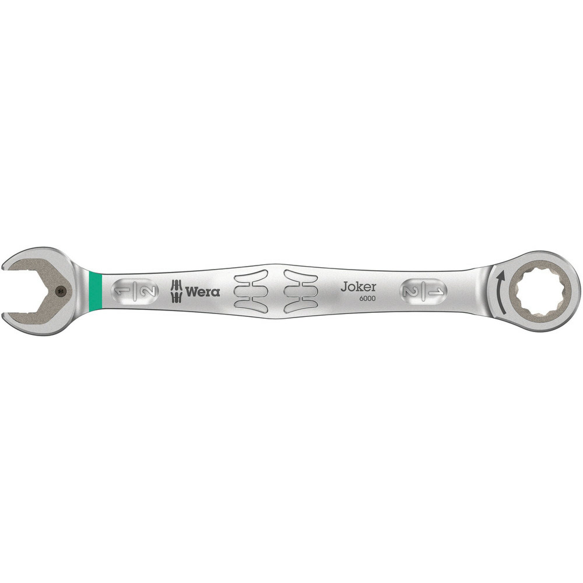 High quality, imperial, combination ratchet wrench by Wera. Everything that a wrench has to be able to do. And a whole lot more. Faster, better, stylish. Yes, a real Joker. The new generation of combination ratchet wrenches. Suitable for hexagon socket screws, bolts or nuts. Comes with holding function, thanks to the metal plate in the jaw, which reduces the risk of dropping nuts and bolts. The replaceable metal plate in the jaw secures nuts and bolts with its extra hard teeth and reduces the danger of slipping. The integrated limit stop prevents any slipping around the bolt head and allows higher torque to be applied. The double-hex geometry makes for a positive connection with nuts or bolts and reduces the risk of slipping. A return angle of only 30° at the open end prevents any time consuming flipping of the wrench. The ratchet mechanism at the ring end, with an exceptional, fine-tooth mechanism - 80 teeth in all - enables flexibility even in very confined working spaces. The specially forged geometry ensures high torque transfer and strength. The ratchet is manufactured out of high performance chrome molybdenum steel with nickel-chrome coating for high corrosion protection. "Take it easy" Tool Finder with colour coding according to sizes.