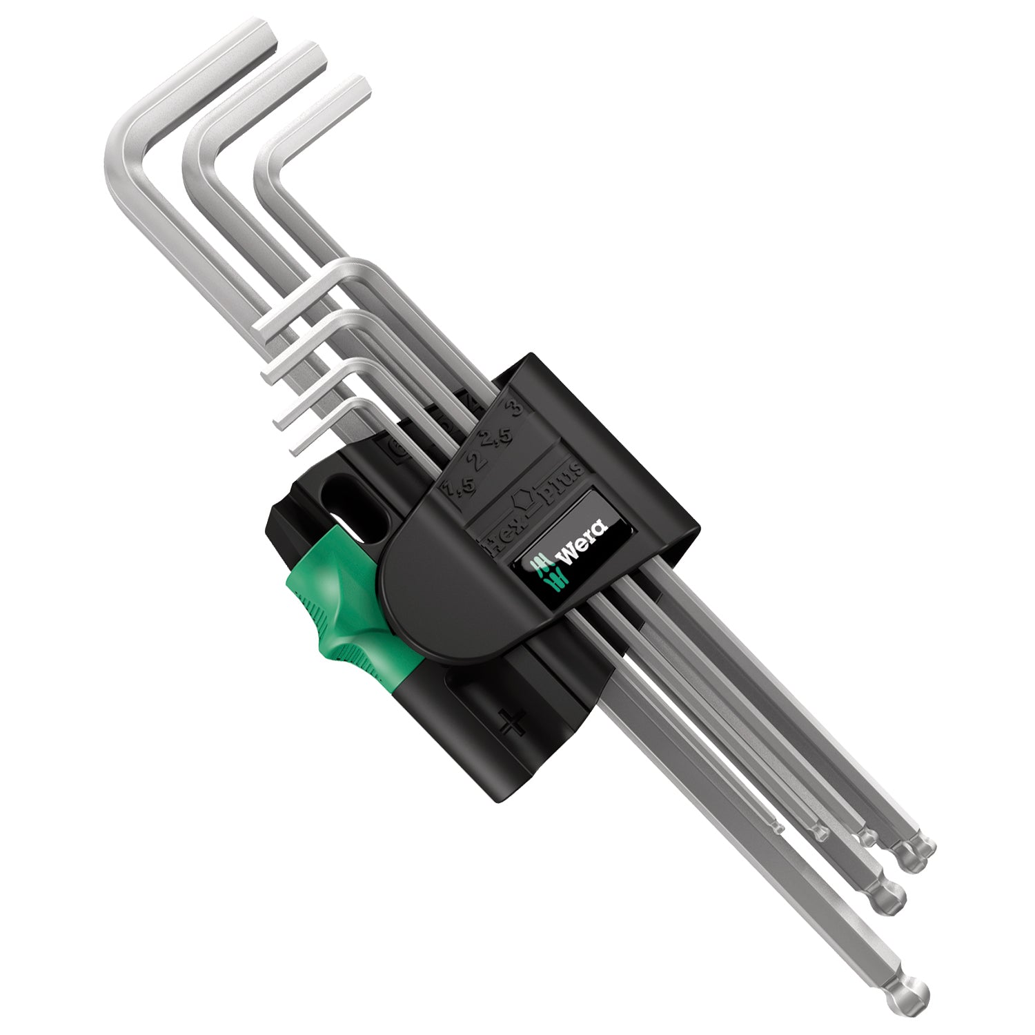 High quality L-key set for hexagonal socket screws in a practical clip fastener with magnetiser. L-keys with Hex-Plus profile: offers a larger contact surface within the screw head. This reduces the notching effects to a minimum and almost completely eliminates the risk of destroying the screw recess. The ball-end on the long arm allows for reliable working even in difficult installation situations. The precise chrome-plated design ensures high corrosion protection. The tools are quickly to hand thanks to the laser-engraved and thereby wear-resistant size markings on the L-keys. It is often useful when the screw can be held on the L-key by magnetic force. The Wera clips with magnetiser enable this advantage in a flash.