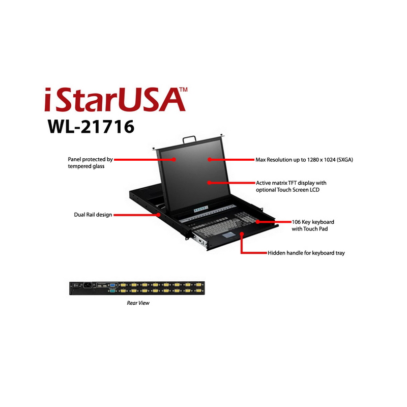 iStarUSA WL-21716 1U Rackmount 17" TFT LCD Keyboard Drawer with Built-in 16-port KVM