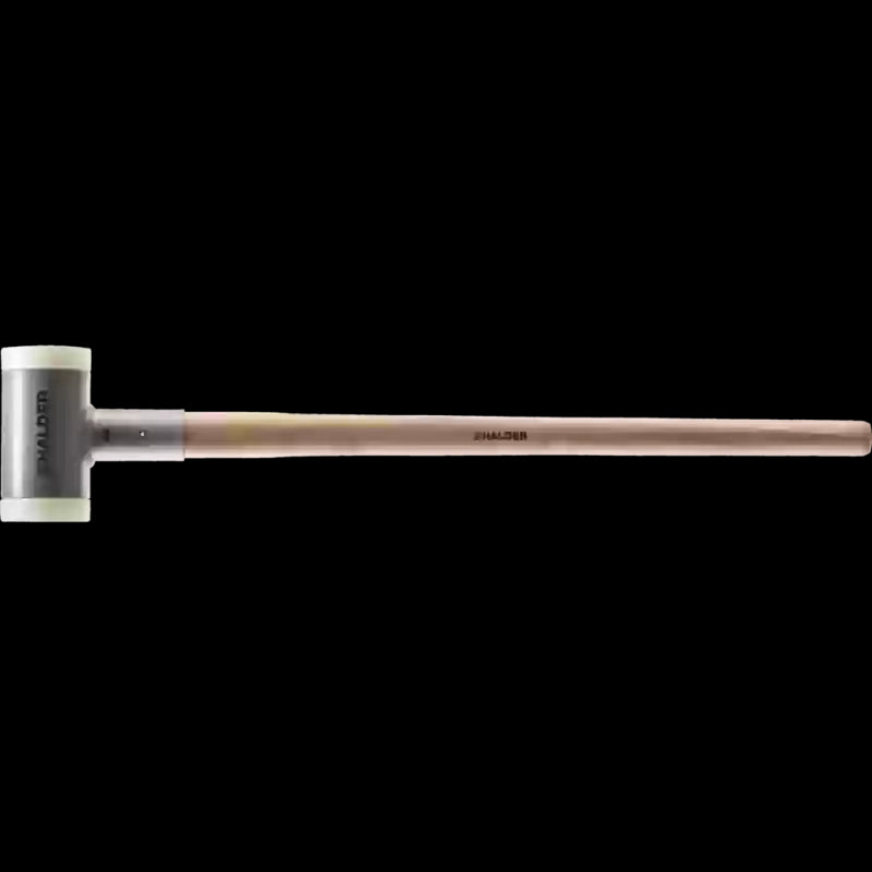 The tubular head of the forestry sledge is filled with steel shot. The resulting effect is that the energy of the steel shot is transferred with a slight delay when the mallet's contact surface hits the workpiece. The reduced rebound allows the impact energy to be absorbed with perfect efficiency. The result is impact of exceptional magnitude.What is more, forestry sledges allow for work with greatly reduced strain on the joints and greater noise-dampening when compared to ordinary steel hammers.Made of special nylon, the replaceable inserts are very durable, noise-dampening, splinter-proof and suitable for extremely high impact forces. They are also flat and allow for the gentle driving of wooden stakes without damaging them.The robot-welded hammer head has a built-in handle protection sleeve.The long-fibre and ultra durable hickory handle is varnished and shaped ergonomically.This product is available in three versions: Head diameters D80mm, D100mm, and D100mm with total weights of 3,600g, 5,000g, and 6,500g, respectively.