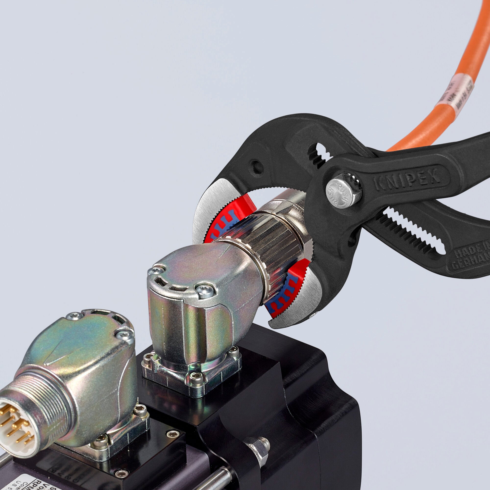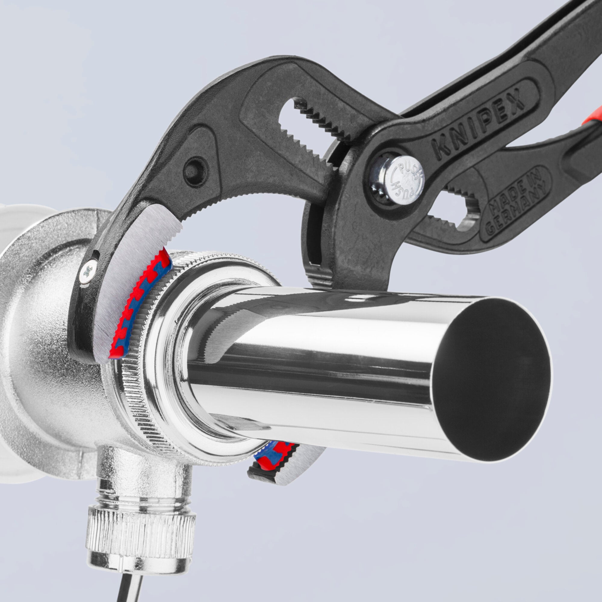 Ideal for tightening and releasing plastic pipe joints, round union nuts, from 3/8" to 3". Fine push-button adjustment for the perfect fit on different sized workpieces. Soft jaw is an ideal tool for cannon plugs in aviation and electrical connections in high performance automotive, truck and trailer applications. Box joint design for greater stability. 25 adjustment positions. With exchangeable plastic jaws to prevent marring work surfaces. Two versions of jaw replacements available - 81 19 250 V01 red jaws, 81 19 250 V02 dual red/blue jaws. Simple to replace plastic jaws- just unthread screw, remove plastic jaw and reverse the process for replacement plastic jaw. Chrome vanadium electric steel; forged, oil-hardened.