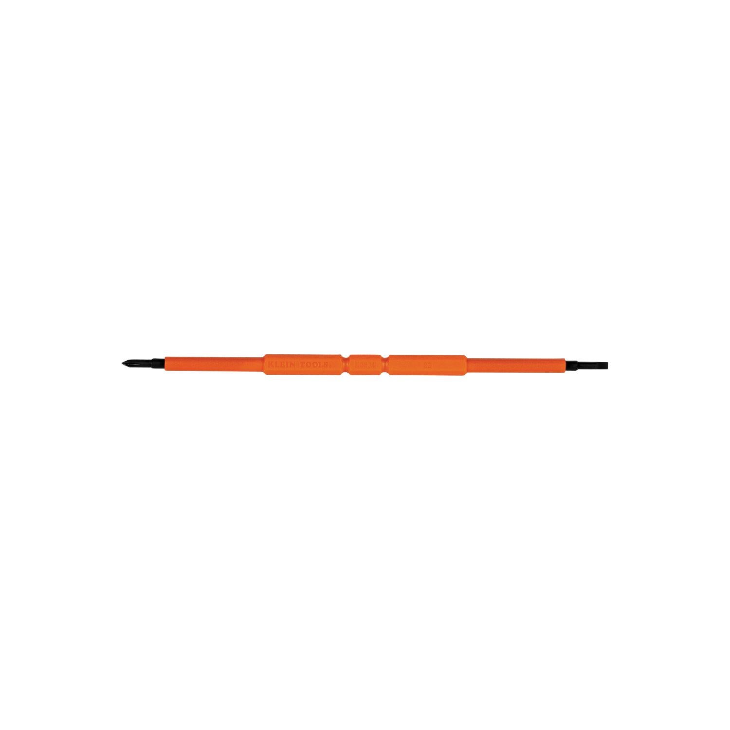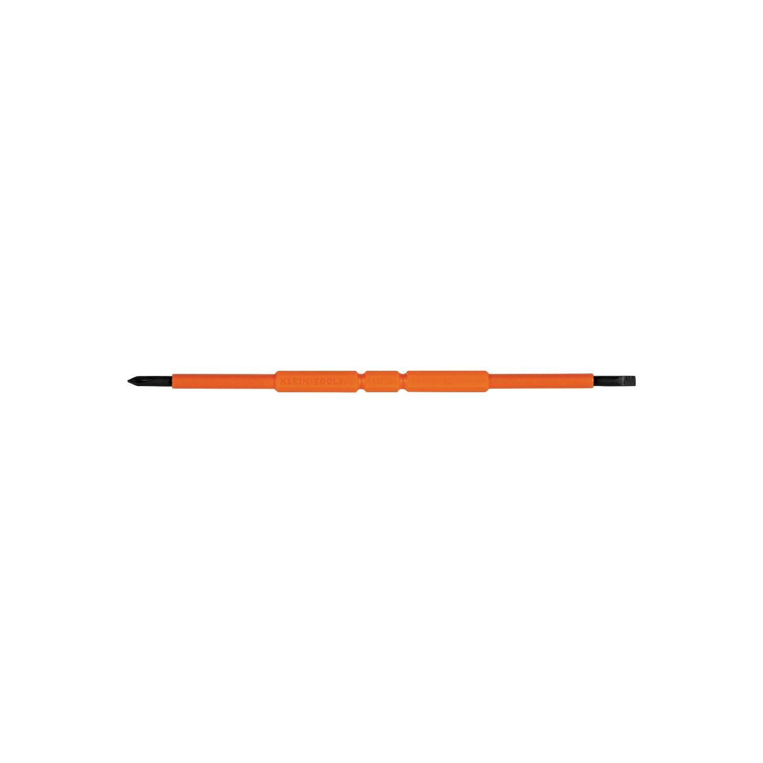 Klein Tools' Insulated Interchangeable blades contain a bright orange coating of insulation that protects from electrical shock, as well as being flame and impact resistant. When the blades are used with the Klein Tools' insulated handle, the complete tool exceeds the ASTM F1505-2021 standards for insulated tools, and are clearly marked with the official 1000V rating symbol. Replacement blades for Klein Tools' Insulated Interchangeable Screwdrivers (Cat. Nos. 32854INSR and 32581INS).