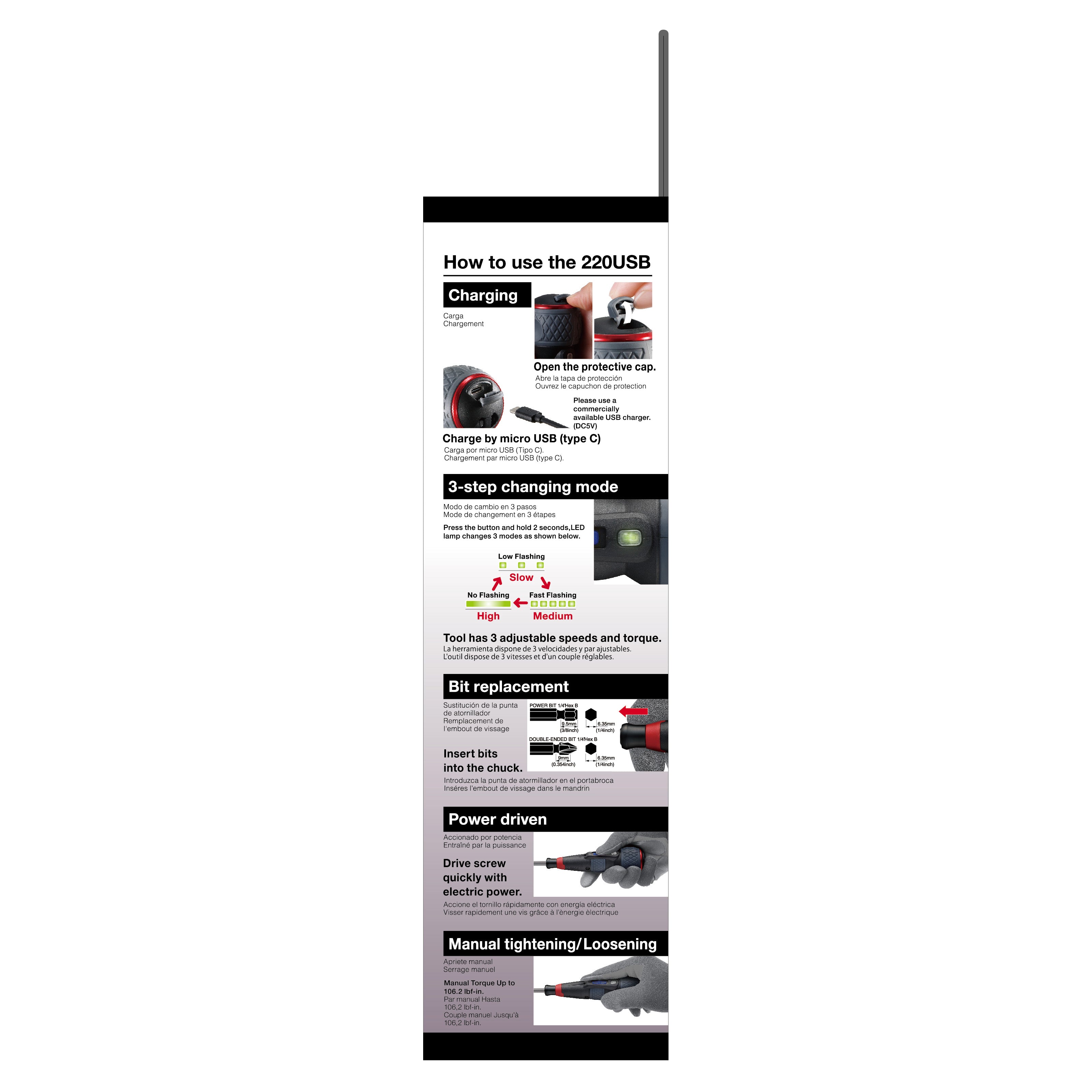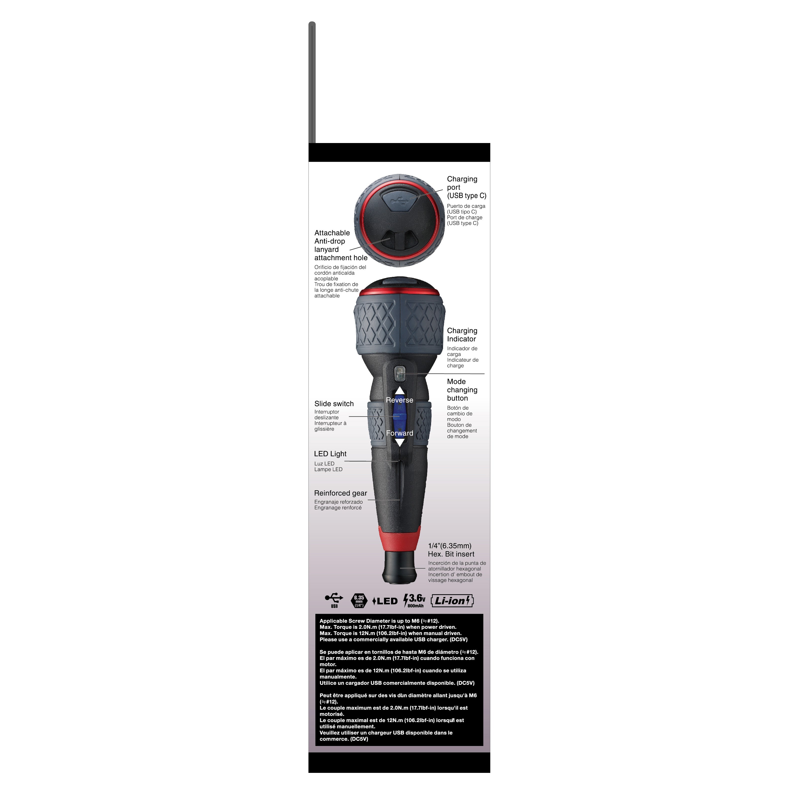 The Vessel Tools 220USBP5U BALL GRIP Rechargeable Screwdriver Plus offers seamless work with dual power and manual driven options. Its interchangeable design works with 1/4 inch hex power bits or double-ended bits (not applicable in Japan). With up to 17.7 lbf-in of power-driven torque and the ability to withstand up to 88.5 lbf-in of manual driven torque, this versatile screwdriver is perfect for any task. Its USB charging type-C ensures easy and convenient charging.