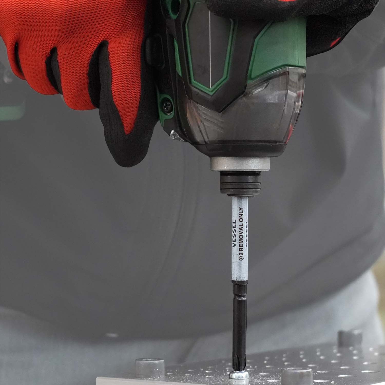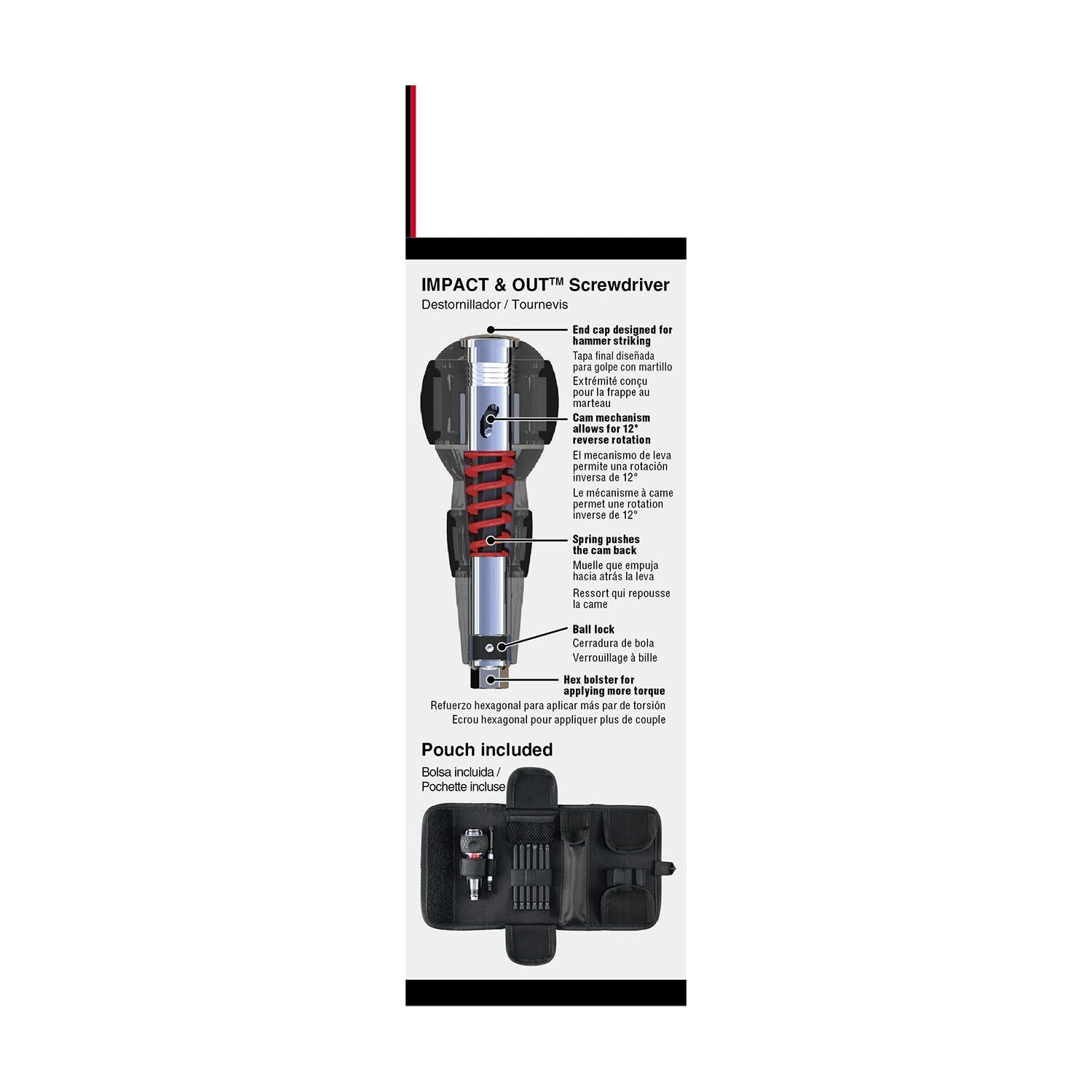 The Vessel Tools 238HWB7PU Impact & Out Screwdriver is designed for maximum effectiveness. The end cap allows for hammer striking, while the cam mechanism allows for 12-degree reverse rotation. The hex bolster provides extra torque for tough jobs. Includes 6 assorted striking bits and 1 screw removing bit for even more versatility.