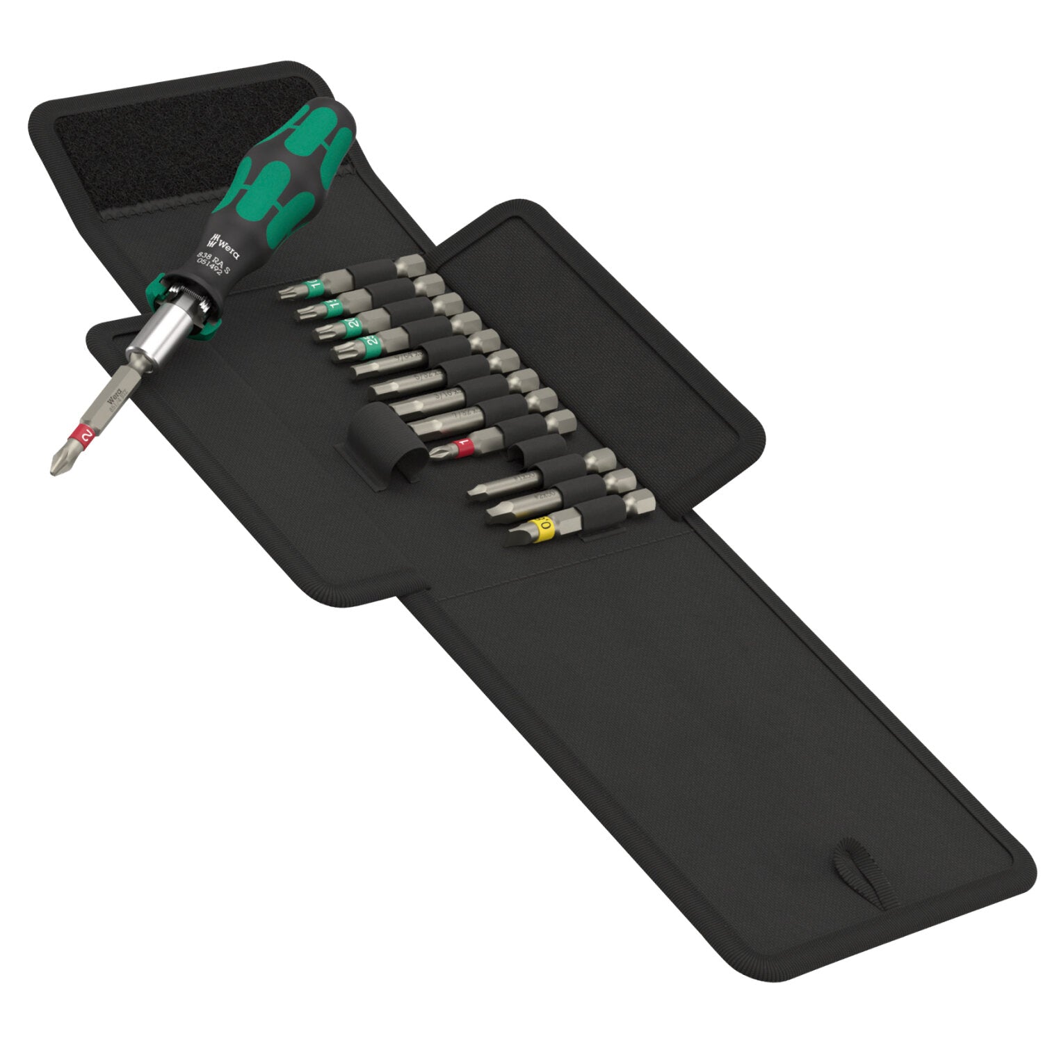 14-piece ratchet screwdriver set. Bitholding screwdriver with intuitive ratchet functionality. Turning the tool speeds up work. The ratchet mechanism completely embedded in the handle ensures very handy and effortless work. Ergonomic switching to clockwise/counterclockwise or position 0. Kraftform Plus handle for ergonomic screwdriving, avoiding blisters and calluses. Magnetic bitholding screwdriver for bits with 1/4" external hexagon drive. 13 tough bits for universal use (Phillips-head Phillips and Pozidriv, TORX®, hexagonal socket and slotted), 50 mm length; chemically nickel-plated, some with "Take it easy" Tool finder: With size stamping and colour coding by output to help you find the required bit easily.